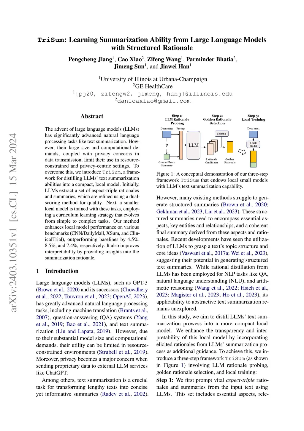 The advent of large language models (LLMs) has significantly advanced natural language processing tasks like text summarization. However, their large size and computational demands, coupled with privacy concerns in data transmission, limit their use in resource-constrained and privacy-centric settings. To overcome this, we introduce TriSum, a framework for distilling LLMs' text summarization abilities into a compact, local model. Initially, LLMs extract a set of aspect-triple rationales and summaries, which are refined using a dual-scoring method for quality. Next, a smaller local model is trained with these tasks, employing a curriculum learning strategy that evolves from simple to complex tasks. Our method enhances local model performance on various benchmarks (CNN/DailyMail, XSum, and ClinicalTrial), outperforming baselines by 4.5%, 8.5%, and 7.4%, respectively. It also improves interpretability by providing insights into the summarization rationale.