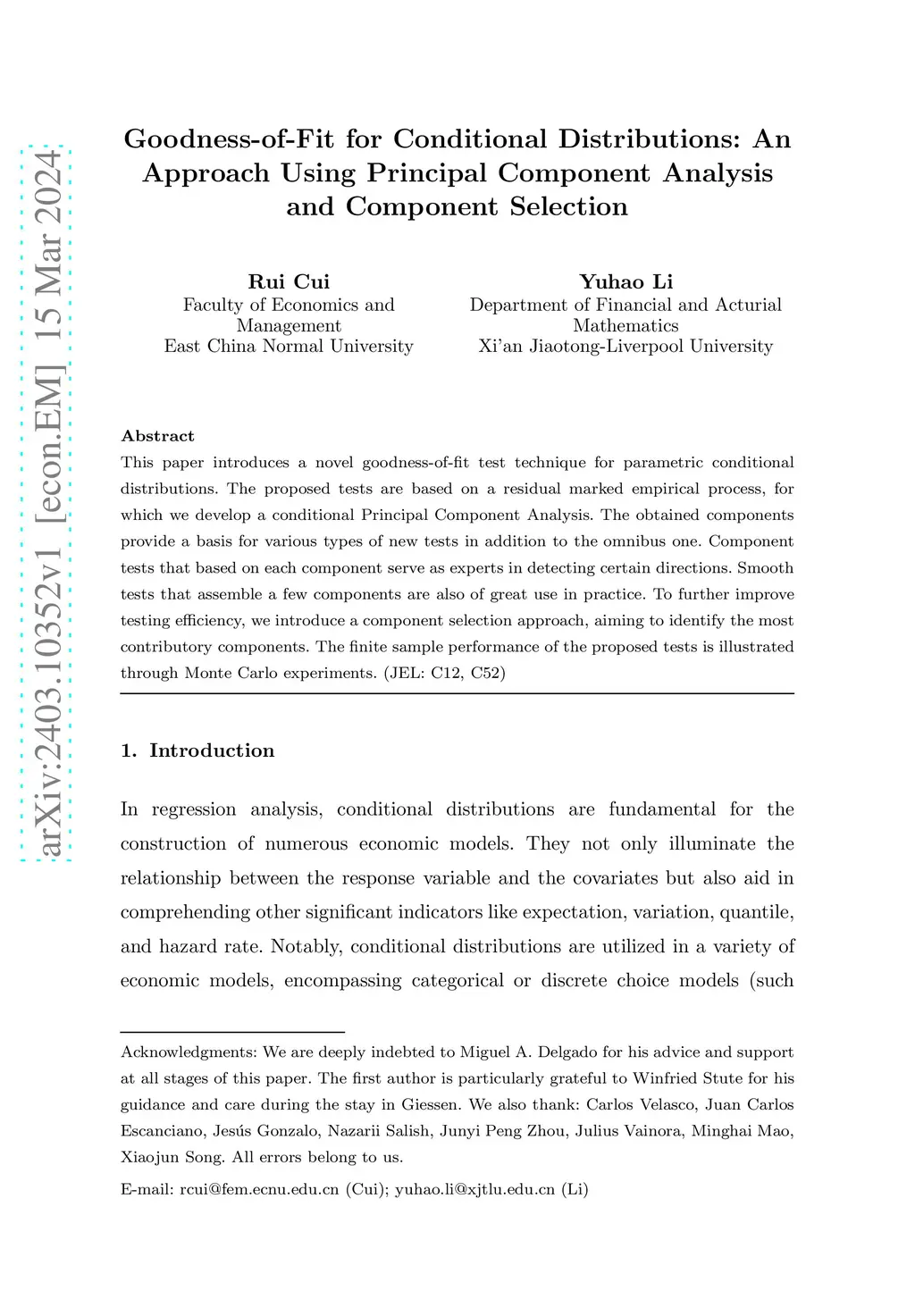This paper introduces a novel goodness-of-fit test technique for parametric conditional distributions. The proposed tests are based on a residual marked empirical process, for which we develop a conditional Principal Component Analysis. The obtained components provide a basis for various types of new tests in addition to the omnibus one. Component tests that based on each component serve as experts in detecting certain directions. Smooth tests that assemble a few components are also of great use in practice. To further improve testing efficiency, we introduce a component selection approach, aiming to identify the most contributory components. The finite sample performance of the proposed tests is illustrated through Monte Carlo experiments.