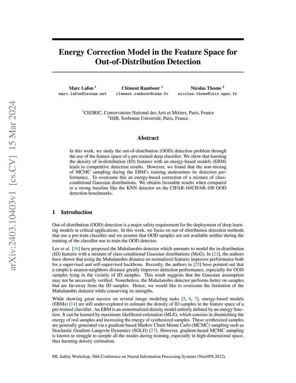 In this work, we study the out-of-distribution (OOD) detection problem through the use of the feature space of a pre-trained deep classifier. We show that learning the density of in-distribution (ID) features with an energy-based models (EBM) leads to competitive detection results. However, we found that the non-mixing of MCMC sampling during the EBM's training undermines its detection performance. To overcome this an energy-based correction of a mixture of class-conditional Gaussian distributions. We obtains favorable results when compared to a strong baseline like the KNN detector on the CIFAR-10/CIFAR-100 OOD detection benchmarks.