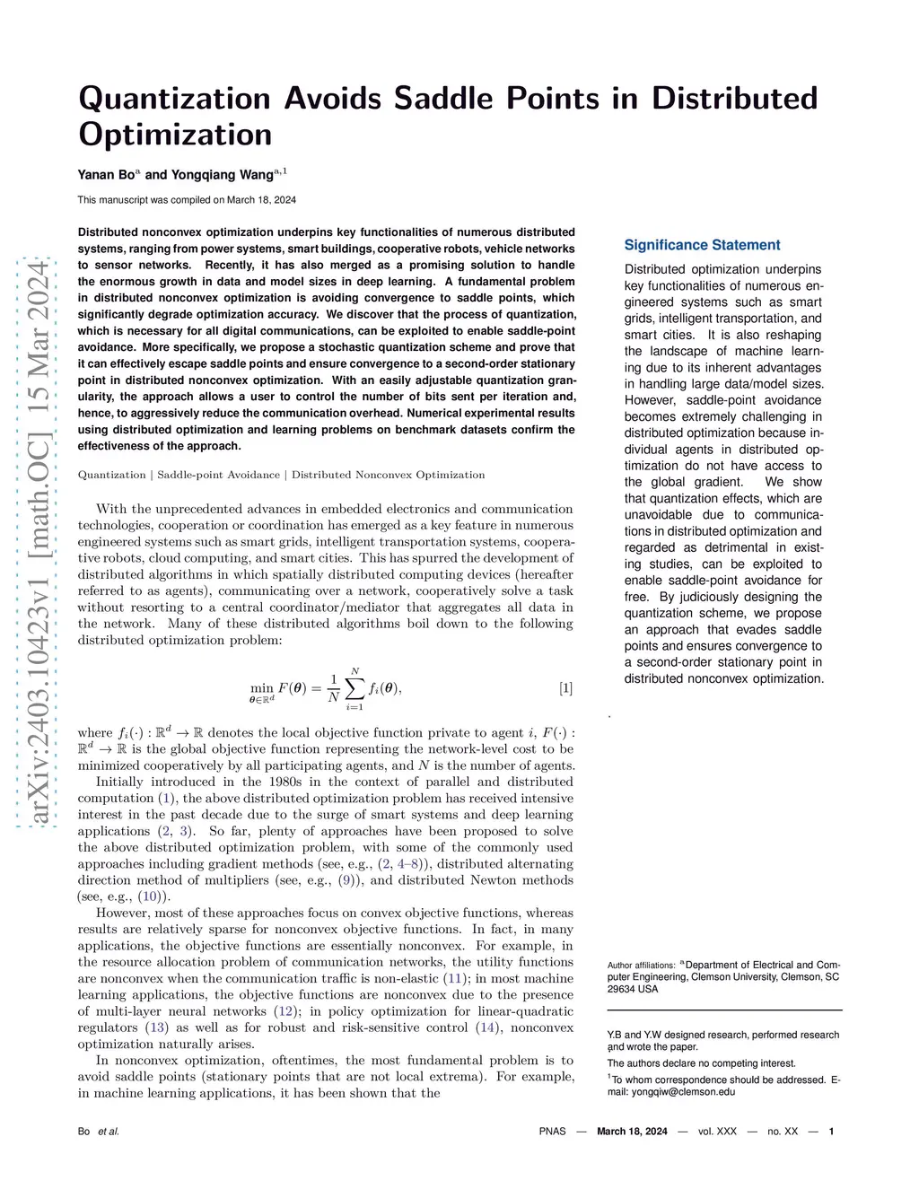 Distributed nonconvex optimization underpins key functionalities of numerous distributed systems, ranging from power systems, smart buildings, cooperative robots, vehicle networks to sensor networks. Recently, it has also merged as a promising solution to handle the enormous growth in data and model sizes in deep learning. A fundamental problem in distributed nonconvex optimization is avoiding convergence to saddle points, which significantly degrade optimization accuracy. We discover that the process of quantization, which is necessary for all digital communications, can be exploited to enable saddle-point avoidance. More specifically, we propose a stochastic quantization scheme and prove that it can effectively escape saddle points and ensure convergence to a second-order stationary point in distributed nonconvex optimization. With an easily adjustable quantization granularity, the approach allows a user to control the number of bits sent per iteration and, hence, to aggressively reduce the communication overhead. Numerical experimental results using distributed optimization and learning problems on benchmark datasets confirm the effectiveness of the approach.