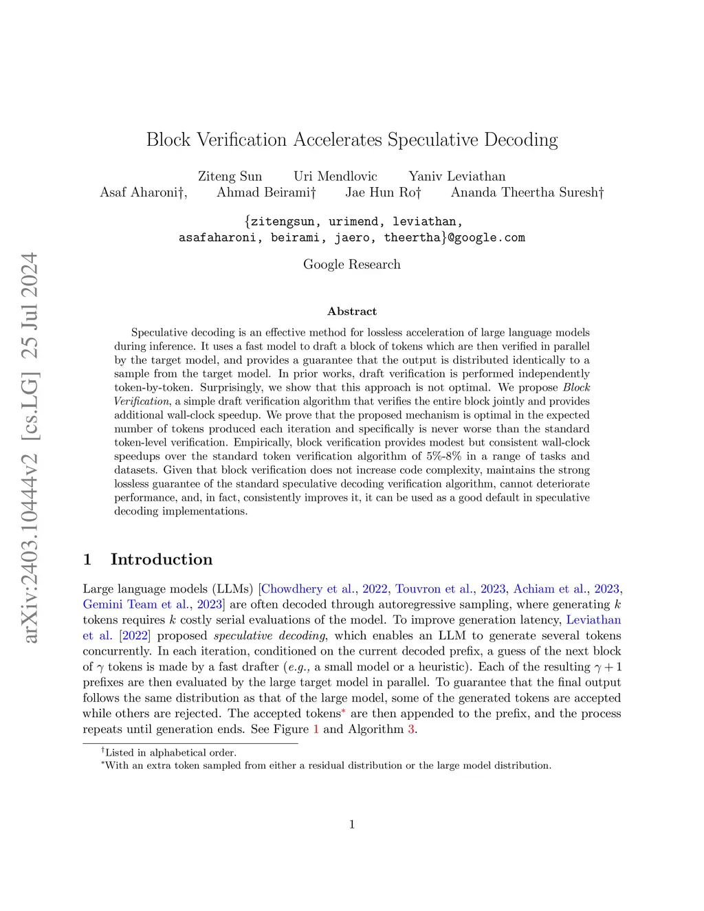 Speculative decoding is an effective method for lossless acceleration of large language models during inference. It uses a fast model to draft a block of tokens which are then verified in parallel by the target model, and provides a guarantee that the output is distributed identically to a sample from the target model. In prior works, draft verification is performed independently token-by-token. Surprisingly, we show that this approach is not optimal. We propose Block Verification, a simple draft verification algorithm that verifies the entire block jointly and provides additional wall-clock speedup. We prove that the proposed mechanism is optimal in the expected number of tokens produced each iteration and specifically is never worse than the standard token-level verification. Empirically, block verification provides modest but consistent wall-clock speedups over the standard token verification algorithm of 5%-8% in a range of tasks and datasets. Given that block verification does not increase code complexity, maintains the strong lossless guarantee of the standard speculative decoding verification algorithm, cannot deteriorate performance, and, in fact, consistently improves it, it can be used as a good default in speculative decoding implementations.