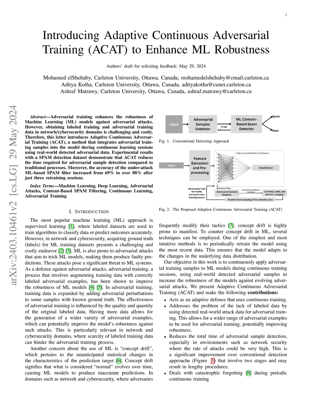 Adversarial training enhances the robustness of Machine Learning (ML) models against adversarial attacks. However, obtaining labeled training and adversarial training data in network/cybersecurity domains is challenging and costly. Therefore, this letter introduces Adaptive Continuous Adversarial Training (ACAT), a method that integrates adversarial training samples into the model during continuous learning sessions using real-world detected adversarial data. Experimental results with a SPAM detection dataset demonstrate that ACAT reduces the time required for adversarial sample detection compared to traditional processes. Moreover, the accuracy of the under-attack ML-based SPAM filter increased from 69% to over 88% after just three retraining sessions.