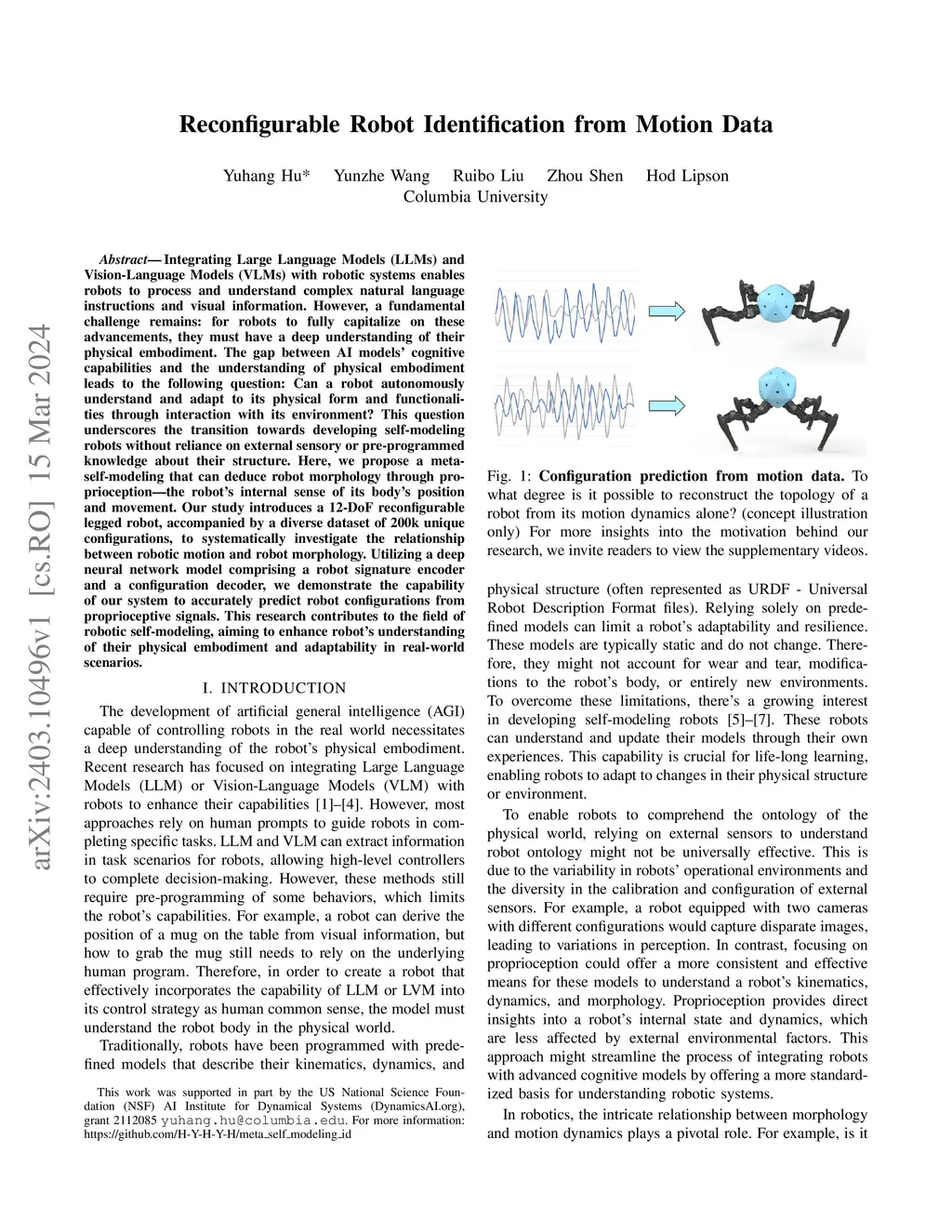 Integrating Large Language Models (VLMs) and Vision-Language Models (VLMs) with robotic systems enables robots to process and understand complex natural language instructions and visual information. However, a fundamental challenge remains: for robots to fully capitalize on these advancements, they must have a deep understanding of their physical embodiment. The gap between AI models cognitive capabilities and the understanding of physical embodiment leads to the following question: Can a robot autonomously understand and adapt to its physical form and functionalities through interaction with its environment? This question underscores the transition towards developing self-modeling robots without reliance on external sensory or pre-programmed knowledge about their structure. Here, we propose a meta self modeling that can deduce robot morphology through proprioception (the internal sense of position and movement). Our study introduces a 12 DoF reconfigurable legged robot, accompanied by a diverse dataset of 200k unique configurations, to systematically investigate the relationship between robotic motion and robot morphology. Utilizing a deep neural network model comprising a robot signature encoder and a configuration decoder, we demonstrate the capability of our system to accurately predict robot configurations from proprioceptive signals. This research contributes to the field of robotic self-modeling, aiming to enhance understanding of their physical embodiment and adaptability in real world scenarios.