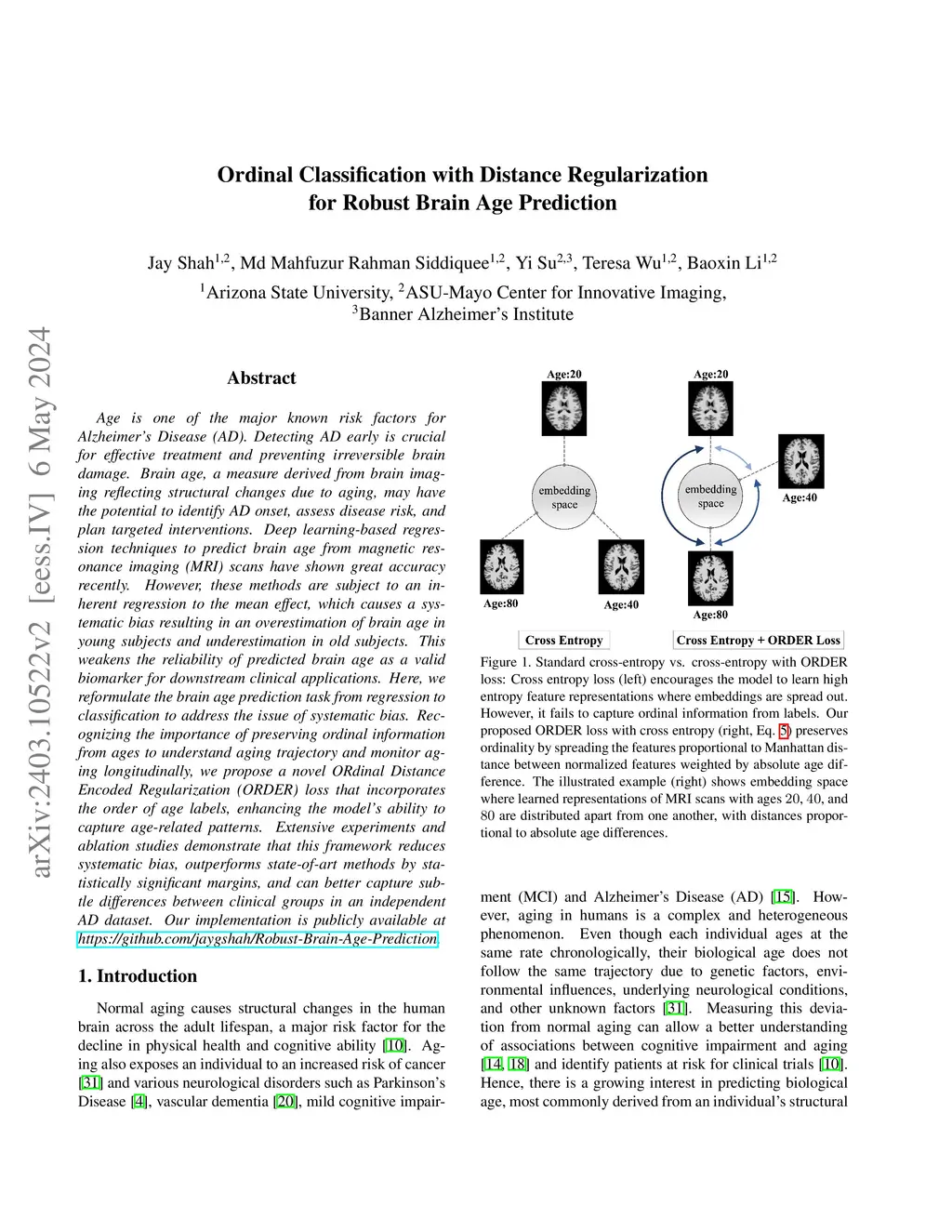 Age is one of the major known risk factors for Alzheimer's Disease (AD). Detecting AD early is crucial for effective treatment and preventing irreversible brain damage. Brain age, a measure derived from brain imaging reflecting structural changes due to aging, may have the potential to identify AD onset, assess disease risk, and plan targeted interventions. Deep learning-based regression techniques to predict brain age from magnetic resonance imaging (MRI) scans have shown great accuracy recently. However, these methods are subject to an inherent regression to the mean effect, which causes a systematic bias resulting in an overestimation of brain age in young subjects and underestimation in old subjects. This weakens the reliability of predicted brain age as a valid biomarker for downstream clinical applications. Here, we reformulate the brain age prediction task from regression to classification to address the issue of systematic bias. Recognizing the importance of preserving ordinal information from ages to understand aging trajectory and monitor aging longitudinally, we propose a novel ORdinal Distance Encoded Regularization (ORDER) loss that incorporates the order of age labels, enhancing the model's ability to capture age-related patterns. Extensive experiments and ablation studies demonstrate that this framework reduces systematic bias, outperforms state-of-art methods by statistically significant margins, and can better capture subtle differences between clinical groups in an independent AD dataset. Our implementation is publicly available at ***.