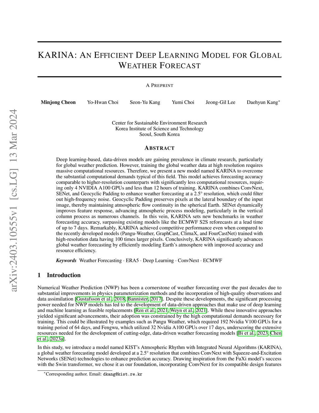 Deep learning-based, data-driven models are gaining prevalence in climate research, particularly for global weather prediction. However, training the global weather data at high resolution requires massive computational resources. Therefore, we present a new model named KARINA to overcome the substantial computational demands typical of this field. This model achieves forecasting accuracy comparable to higher-resolution counterparts with significantly less computational resources, requiring only 4 NVIDIA A100 GPUs and less than 12 hours of training. KARINA combines ConvNext, SENet, and Geocyclic Padding to enhance weather forecasting at a 2.5{\deg} resolution, which could filter out high-frequency noise. Geocyclic Padding preserves pixels at the lateral boundary of the input image, thereby maintaining atmospheric flow continuity in the spherical Earth. SENet dynamically improves feature response, advancing atmospheric process modeling, particularly in the vertical column process as numerous channels. In this vein, KARINA sets new benchmarks in weather forecasting accuracy, surpassing existing models like the ECMWF S2S reforecasts at a lead time of up to 7 days. Remarkably, KARINA achieved competitive performance even when compared to the recently developed models (Pangu-Weather, GraphCast, ClimaX, and FourCastNet) trained with high-resolution data having 100 times larger pixels. Conclusively, KARINA significantly advances global weather forecasting by efficiently modeling Earth's atmosphere with improved accuracy and resource efficiency.