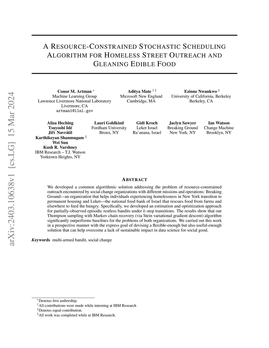 We developed a common algorithmic solution addressing the problem of resource-constrained outreach encountered by social change organizations with different missions and operations: Breaking Ground -- an organization that helps individuals experiencing homelessness in New York transition to permanent housing and Leket -- the national food bank of Israel that rescues food from farms and elsewhere to feed the hungry. Specifically, we developed an estimation and optimization approach for partially-observed episodic restless bandits under -step transitions. The results show that our Thompson sampling with Markov chain recovery (via Stein variational gradient descent) algorithm significantly outperforms baselines for the problems of both organizations. We carried out this work in a prospective manner with the express goal of devising a flexible-enough but also useful-enough solution that can help overcome a lack of sustainable impact in data science for social good.