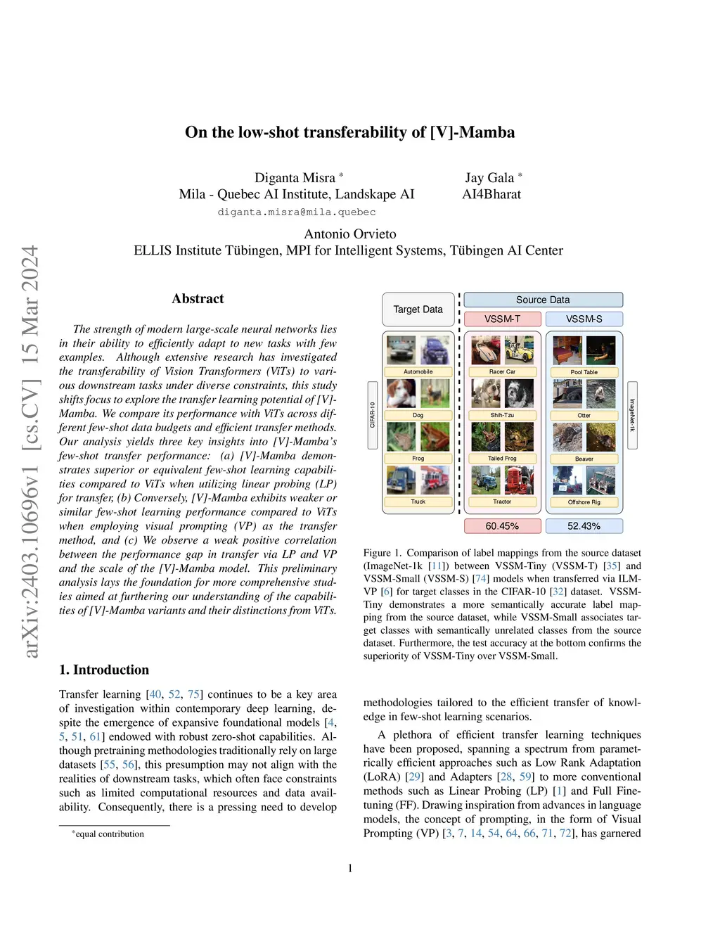 The strength of modern large-scale neural networks lies in their ability to efficiently adapt to new tasks with few examples. Although extensive research has investigated the transferability of Vision Transformers (ViTs) to various downstream tasks under diverse constraints, this study shifts focus to explore the transfer learning potential of [V]-Mamba. We compare its performance with ViTs across different few-shot data budgets and efficient transfer methods. Our analysis yields three key insights into [V]-Mamba's few-shot transfer performance: (a) [V]-Mamba demonstrates superior or equivalent few-shot learning capabilities compared to ViTs when utilizing linear probing (LP) for transfer, (b) Conversely, [V]-Mamba exhibits weaker or similar few-shot learning performance compared to ViTs when employing visual prompting (VP) as the transfer method, and (c) We observe a weak positive correlation between the performance gap in transfer via LP and VP and the scale of the [V]-Mamba model. This preliminary analysis lays the foundation for more comprehensive studies aimed at furthering our understanding of the capabilities of [V]-Mamba variants and their distinctions from ViTs.