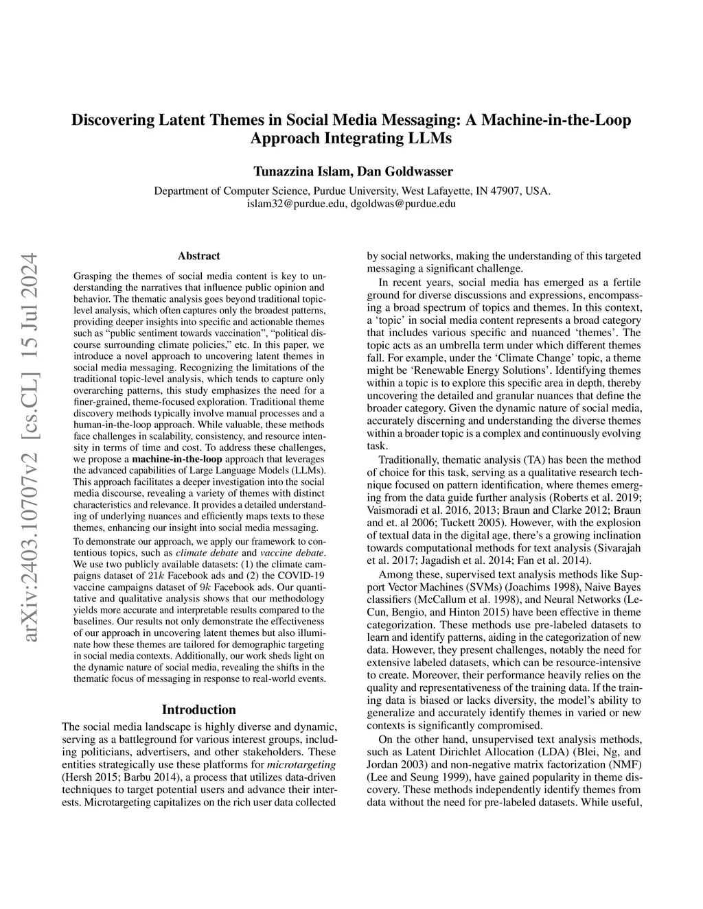 Grasping the themes of social media content is key to understanding the narratives that influence public opinion and behavior. The thematic analysis goes beyond traditional topic-level analysis, which often captures only the broadest patterns, providing deeper insights into specific and actionable themes such as "public sentiment towards vaccination", "political discourse surrounding climate policies," etc. In this paper, we introduce a novel approach to uncovering latent themes in social media messaging. Recognizing the limitations of the traditional topic-level analysis, which tends to capture only overarching patterns, this study emphasizes the need for a finer-grained, theme-focused exploration. Traditional theme discovery methods typically involve manual processes and a human-in-the-loop approach. While valuable, these methods face challenges in scalability, consistency, and resource intensity in terms of time and cost. To address these challenges, we propose a machine-in-the-loop approach that leverages the advanced capabilities of Large Language Models (LLMs). To demonstrate our approach, we apply our framework to contentious topics, such as climate debate and vaccine debate. We use two publicly available datasets: (1) the climate campaigns dataset of 21k Facebook ads and (2) the COVID-19 vaccine campaigns dataset of 9k Facebook ads. Our quantitative and qualitative analysis shows that our methodology yields more accurate and interpretable results compared to the baselines. Our results not only demonstrate the effectiveness of our approach in uncovering latent themes but also illuminate how these themes are tailored for demographic targeting in social media contexts. Additionally, our work sheds light on the dynamic nature of social media, revealing the shifts in the thematic focus of messaging in response to real-world events.