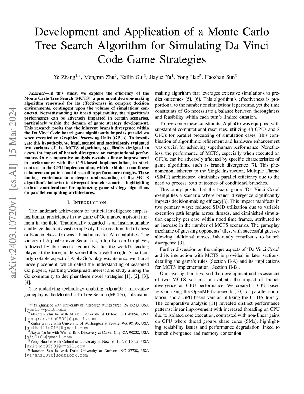 In this study, we explore the efficiency of the Monte Carlo Tree Search (MCTS), a prominent decision-making algorithm renowned for its effectiveness in complex decision environments, contingent upon the volume of simulations conducted. Notwithstanding its broad applicability, the algorithm's performance can be adversely impacted in certain scenarios, particularly within the domain of game strategy development. This research posits that the inherent branch divergence within the Da Vinci Code board game significantly impedes parallelism when executed on Graphics Processing Units (GPUs). To investigate this hypothesis, we implemented and meticulously evaluated two variants of the MCTS algorithm, specifically designed to assess the impact of branch divergence on computational performance. Our comparative analysis reveals a linear improvement in performance with the CPU-based implementation, in stark contrast to the GPU implementation, which exhibits a non-linear enhancement pattern and discernible performance troughs. These findings contribute to a deeper understanding of the MCTS algorithm's behavior in divergent branch scenarios, highlighting critical considerations for optimizing game strategy algorithms on parallel computing architectures.