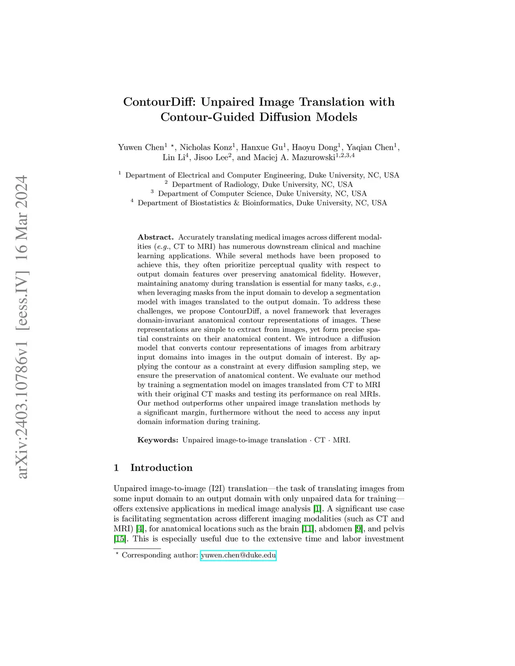 ContourDiff: Unpaired Medical Image Translation with Structural Consistency