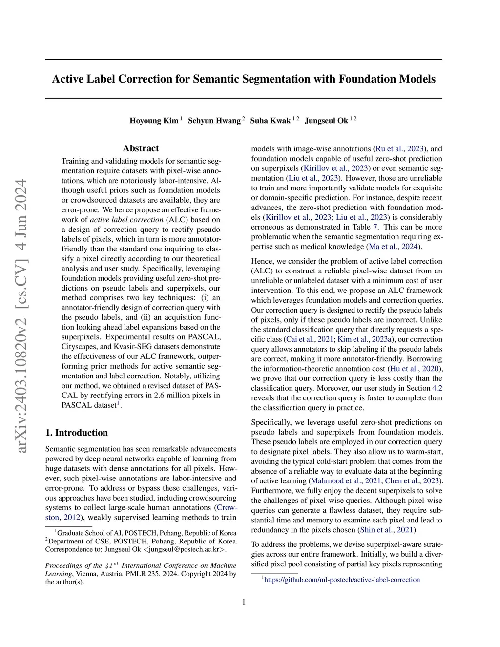 Training and validating models for semantic segmentation require datasets with pixel-wise annotations, which are notoriously labor-intensive. Although useful priors such as foundation models or crowdsourced datasets are available, they are error-prone. We hence propose an effective framework of active label correction (ALC) based on a design of correction query to rectify pseudo labels of pixels, which in turn is more annotator-friendly than the standard one inquiring to classify a pixel directly according to our theoretical analysis and user study. Specifically, leveraging foundation models providing useful zero-shot predictions on pseudo labels and superpixels, our method comprises two key techniques: (i) an annotator-friendly design of correction query with the pseudo labels, and (ii) an acquisition function looking ahead label expansions based on the superpixels. Experimental results on PASCAL, Cityscapes, and Kvasir-SEG datasets demonstrate the effectiveness of our ALC framework, outperforming prior methods for active semantic segmentation and label correction. Notably, utilizing our method, we obtained a revised dataset of PASCAL by rectifying errors in 2.6 million pixels in PASCAL dataset.