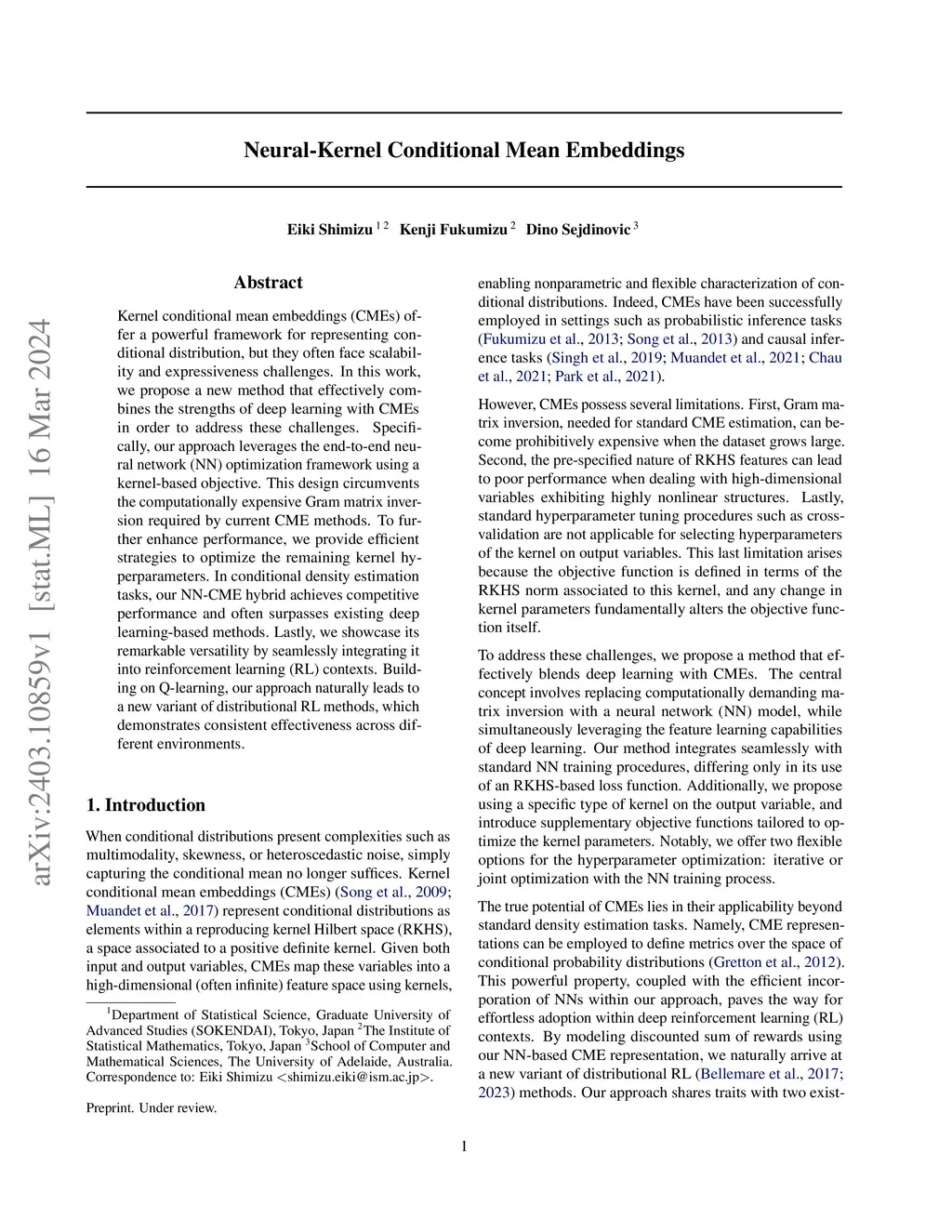 Kernel conditional mean embeddings (CMEs) offer a powerful framework for representing conditional distribution, but they often face scalability and expressiveness challenges. In this work, we propose a new method that effectively combines the strengths of deep learning with CMEs in order to address these challenges. Specifically, our approach leverages the end-to-end neural network (NN) optimization framework using a kernel-based objective. This design circumvents the computationally expensive Gram matrix inversion required by current CME methods. To further enhance performance, we provide efficient strategies to optimize the remaining kernel hyperparameters. In conditional density estimation tasks, our NN-CME hybrid achieves competitive performance and often surpasses existing deep learning-based methods. Lastly, we showcase its remarkable versatility by seamlessly integrating it into reinforcement learning (RL) contexts. Building on Q-learning, our approach naturally leads to a new variant of distributional RL methods, which demonstrates consistent effectiveness across different environments.
