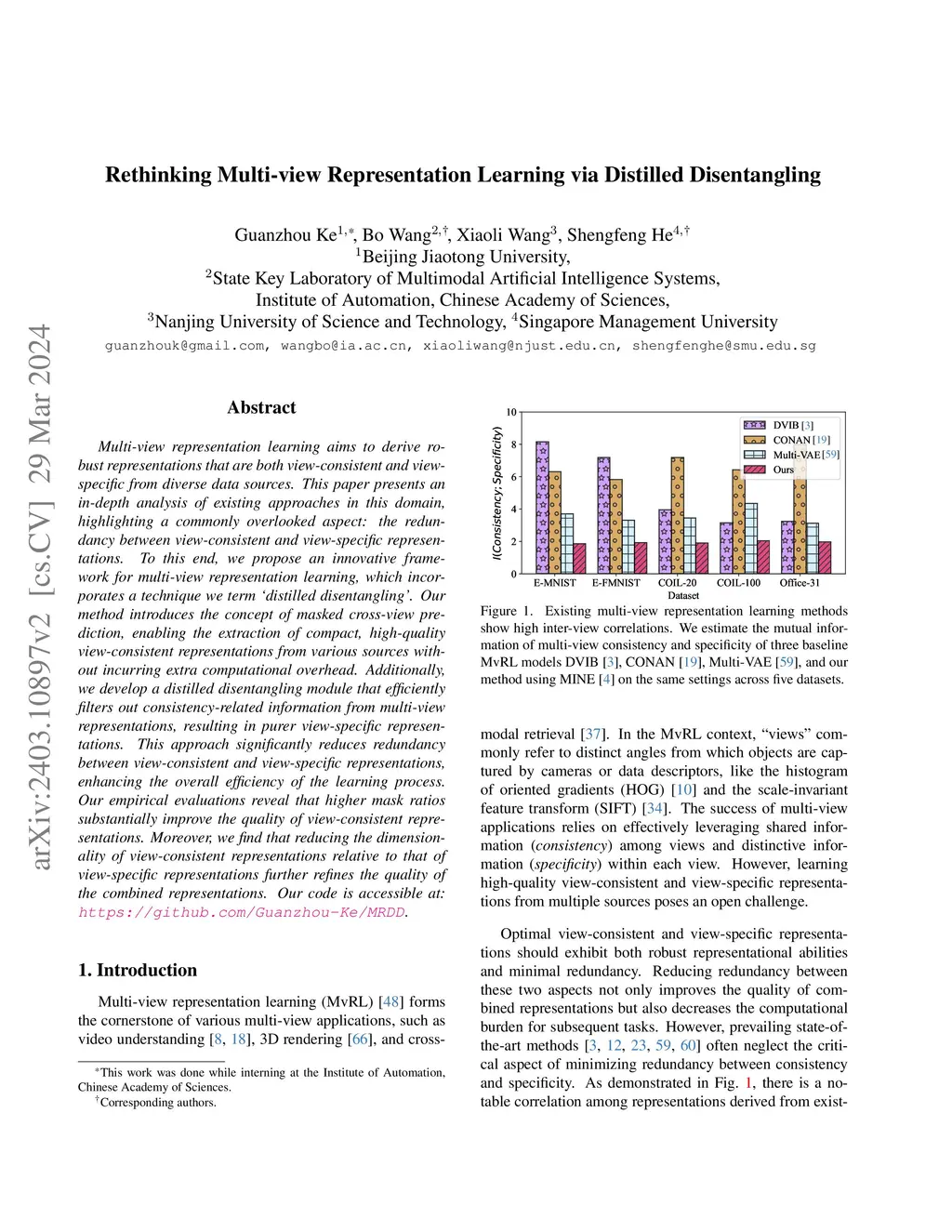 Multi-view representation learning aims to derive robust representations that are both view-consistent and view-specific from diverse data sources. This paper presents an in-depth analysis of existing approaches in this domain, highlighting a commonly overlooked aspect: the redundancy between view-consistent and view-specific representations. To this end, we propose an innovative framework for multi-view representation learning, which incorporates a technique we term 'distilled disentangling'. Our method introduces the concept of masked cross-view prediction, enabling the extraction of compact, high-quality view-consistent representations from various sources without incurring extra computational overhead. Additionally, we develop a distilled disentangling module that efficiently filters out consistency-related information from multi-view representations, resulting in purer view-specific representations. This approach significantly reduces redundancy between view-consistent and view-specific representations, enhancing the overall efficiency of the learning process. Our empirical evaluations reveal that higher mask ratios substantially improve the quality of view-consistent representations. Moreover, we find that reducing the dimensionality of view-consistent representations relative to that of view-specific representations further refines the quality of the combined representations. Our code is accessible at: https://github.com/Guanzhou-Ke/MRDD.