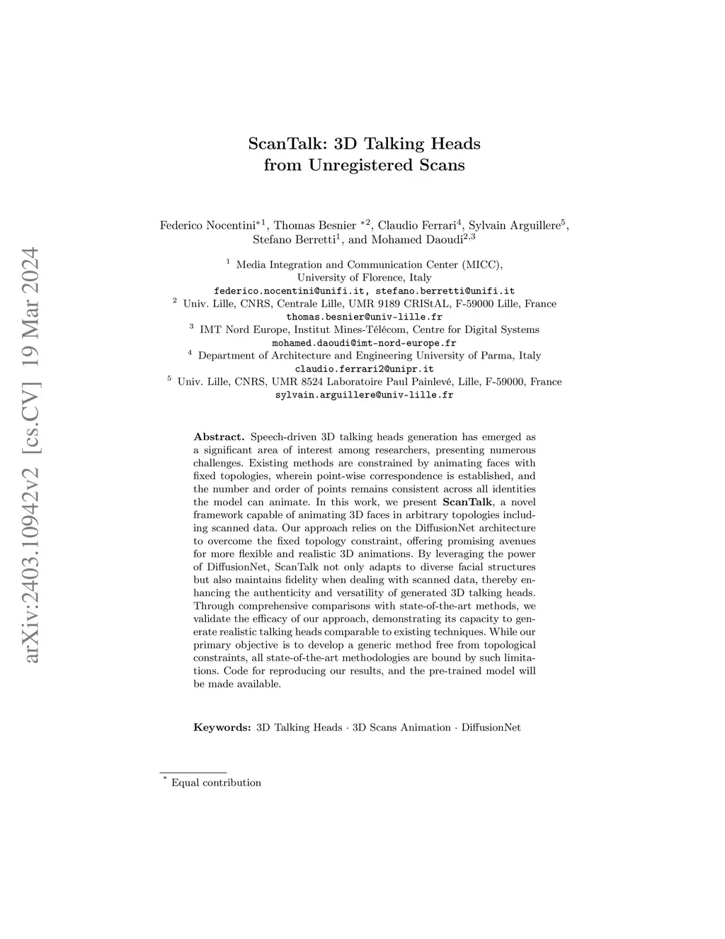 Speech-driven 3D talking heads generation has emerged as a significant area of interest among researchers, presenting numerous challenges. Existing methods are constrained by animating faces with fixed topologies, wherein point-wise correspondence is established, and the number and order of points remains consistent across all identities the model can animate. In this work, we present ScanTalk, a novel framework capable of animating 3D faces in arbitrary topologies including scanned data. Our approach relies on the DiffusionNet architecture to overcome the fixed topology constraint, offering promising avenues for more flexible and realistic 3D animations. By leveraging the power of DiffusionNet, ScanTalk not only adapts to diverse facial structures but also maintains fidelity when dealing with scanned data, thereby enhancing the authenticity and versatility of generated 3D talking heads. Through comprehensive comparisons with state-of-the-art methods, we validate the efficacy of our approach, demonstrating its capacity to generate realistic talking heads comparable to existing techniques. While our primary objective is to develop a generic method free from topological constraints, all state-of-the-art methodologies are bound by such limitations. Code for reproducing our results, and the pre-trained model will be made available.