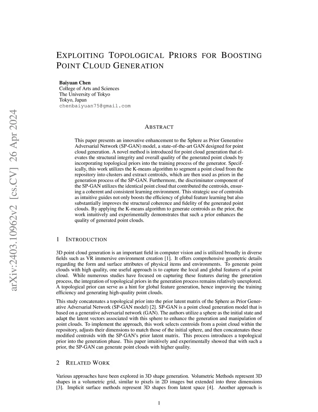 This paper presents an innovative enhancement to the Sphere as Prior Generative Adversarial Network (SP-GAN) model, a state-of-the-art GAN designed for point cloud generation. A novel method is introduced for point cloud generation that elevates the structural integrity and overall quality of the generated point clouds by incorporating topological priors into the training process of the generator. Specifically, this work utilizes the K-means algorithm to segment a point cloud from the repository into clusters and extract centroids, which are then used as priors in the generation process of the SP-GAN. Furthermore, the discriminator component of the SP-GAN utilizes the identical point cloud that contributed the centroids, ensuring a coherent and consistent learning environment. This strategic use of centroids as intuitive guides not only boosts the efficiency of global feature learning but also substantially improves the structural coherence and fidelity of the generated point clouds. By applying the K-means algorithm to generate centroids as the prior, the work intuitively and experimentally demonstrates that such a prior enhances the quality of generated point clouds.