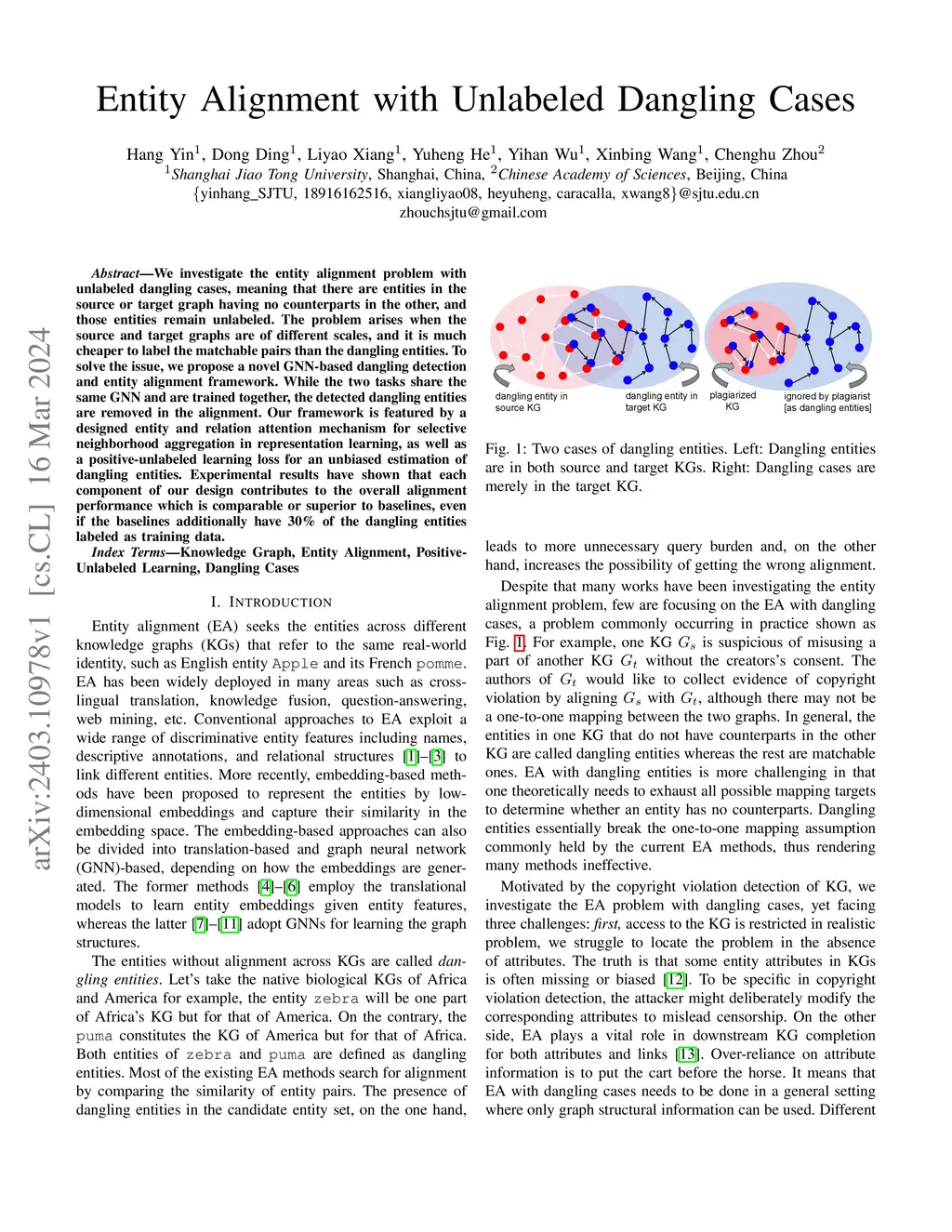 We investigate the entity alignment problem with unlabeled dangling cases, meaning that there are entities in the source or target graph having no counterparts in the other, and those entities remain unlabeled. The problem arises when the source and target graphs are of different scales, and it is much cheaper to label the matchable pairs than the dangling entities. To solve the issue, we propose a novel GNN-based dangling detection and entity alignment framework. While the two tasks share the same GNN and are trained together, the detected dangling entities are removed in the alignment. Our framework is featured by a designed entity and relation attention mechanism for selective neighborhood aggregation in representation learning, as well as a positive-unlabeled learning loss for an unbiased estimation of dangling entities. Experimental results have shown that each component of our design contributes to the overall alignment performance which is comparable or superior to baselines, even if the baselines additionally have 30\% of the dangling entities labeled as training data.