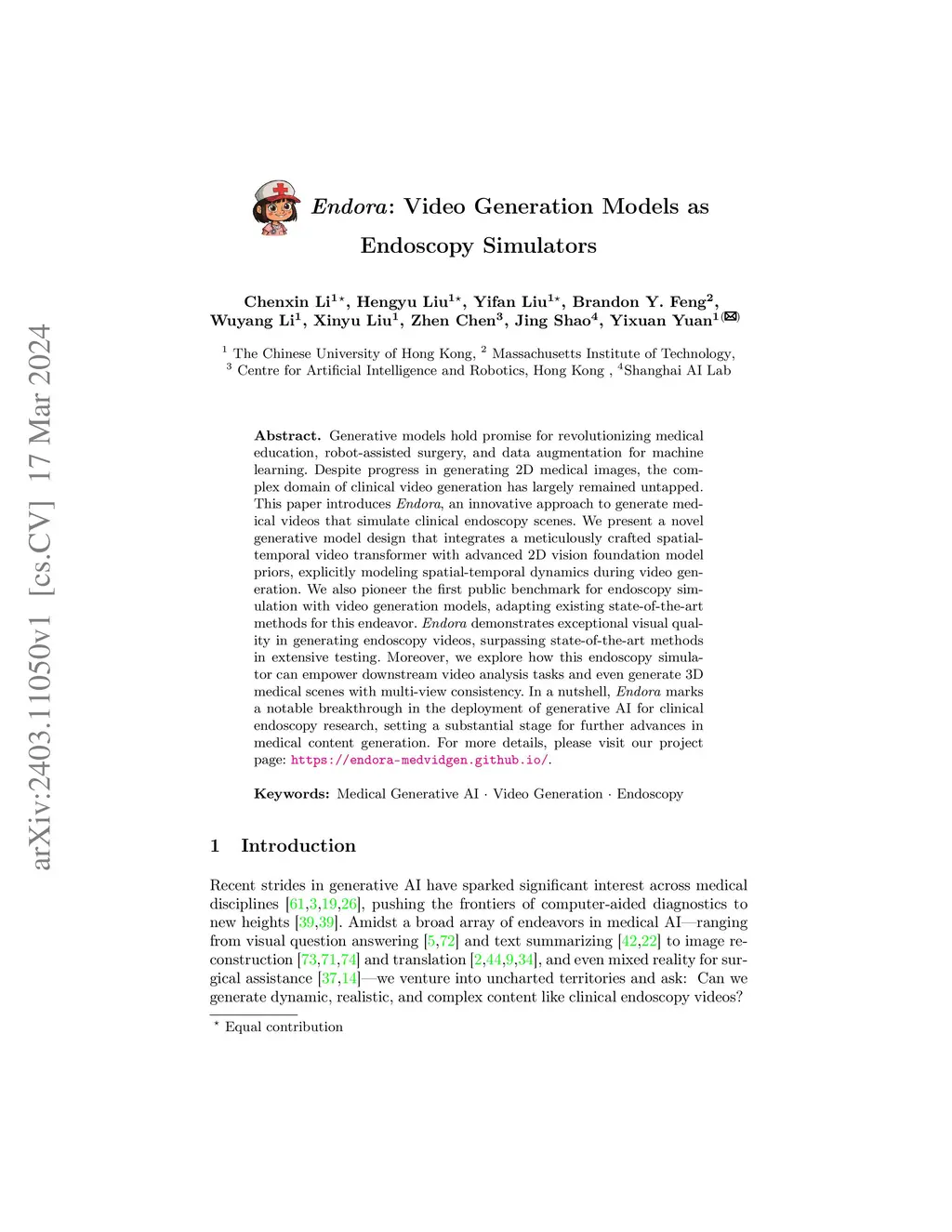 Generative models hold promise for revolutionizing medical education, robot-assisted surgery, and data augmentation for machine learning. Despite progress in generating 2D medical images, the complex domain of clinical video generation has largely remained untapped.This paper introduces \model, an innovative approach to generate medical videos that simulate clinical endoscopy scenes. We present a novel generative model design that integrates a meticulously crafted spatial-temporal video transformer with advanced 2D vision foundation model priors, explicitly modeling spatial-temporal dynamics during video generation. We also pioneer the first public benchmark for endoscopy simulation with video generation models, adapting existing state-of-the-art methods for this endeavor.Endora demonstrates exceptional visual quality in generating endoscopy videos, surpassing state-of-the-art methods in extensive testing. Moreover, we explore how this endoscopy simulator can empower downstream video analysis tasks and even generate 3D medical scenes with multi-view consistency. In a nutshell, Endora marks a notable breakthrough in the deployment of generative AI for clinical endoscopy research, setting a substantial stage for further advances in medical content generation. For more details, please visit our project page: https://endora-medvidgen.github.io/.
