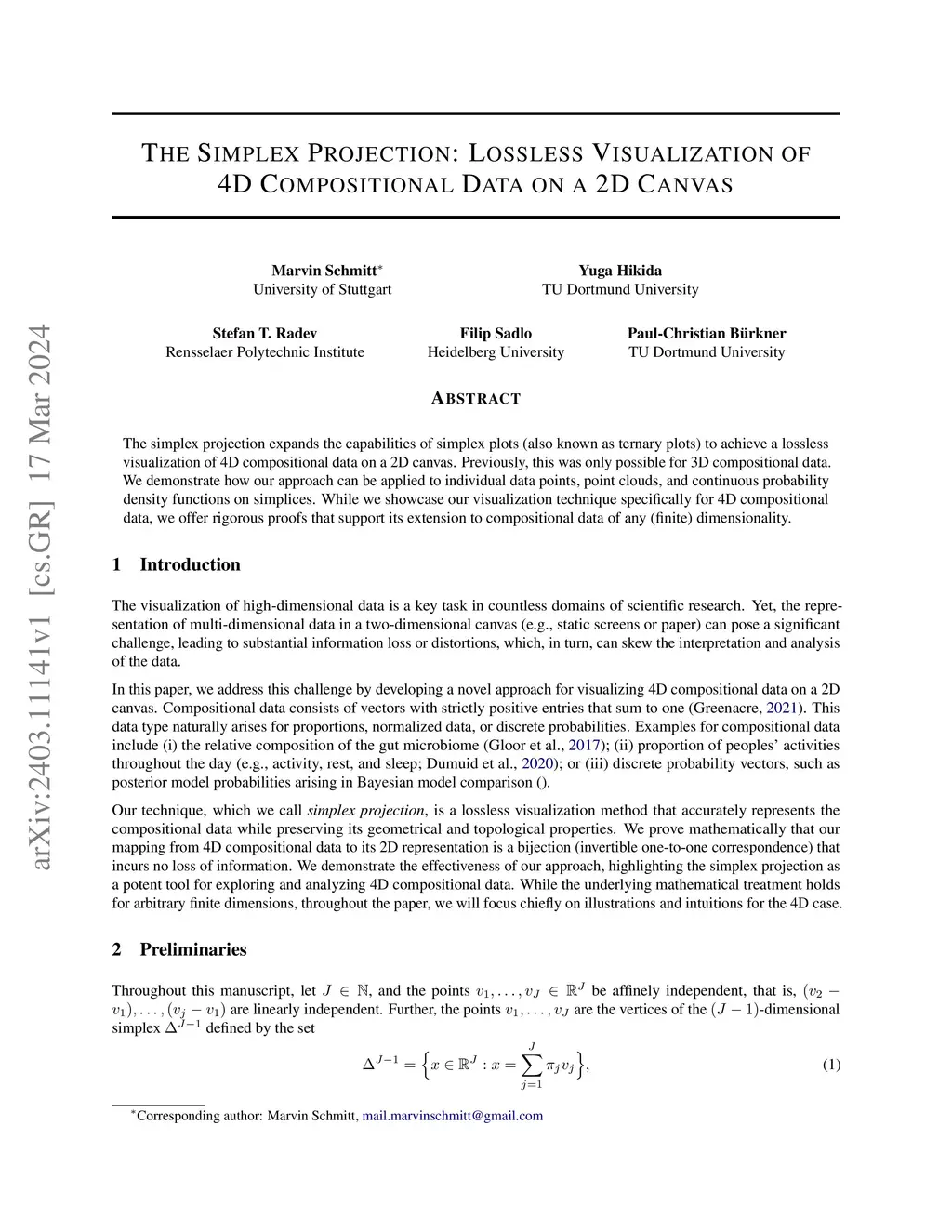 The simplex projection expands the capabilities of simplex plots (also known as ternary plots) to achieve a lossless visualization of 4D compositional data on a 2D canvas. Previously, this was only possible for 3D compositional data. We demonstrate how our approach can be applied to individual data points, point clouds, and continuous probability density functions on simplices. While we showcase our visualization technique specifically for 4D compositional data, we offer rigorous proofs that support its extension to compositional data of any (finite) dimensionality.