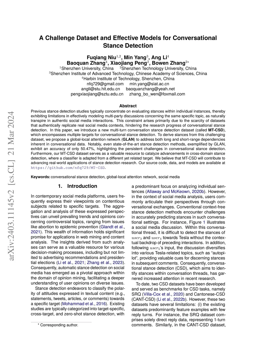 Previous stance detection studies typically concentrate on evaluating stances within individual instances, thereby exhibiting limitations in effectively modeling multi-party discussions concerning the same specific topic, as naturally transpire in authentic social media interactions. This constraint arises primarily due to the scarcity of datasets that authentically replicate real social media contexts, hindering the research progress of conversational stance detection. In this paper, we introduce a new multi-turn conversation stance detection dataset (called \textbf{MT-CSD}), which encompasses multiple targets for conversational stance detection. To derive stances from this challenging dataset, we propose a global-local attention network (\textbf{GLAN}) to address both long and short-range dependencies inherent in conversational data. Notably, even state-of-the-art stance detection methods, exemplified by GLAN, exhibit an accuracy of only 50.47\%, highlighting the persistent challenges in conversational stance detection. Furthermore, our MT-CSD dataset serves as a valuable resource to catalyze advancements in cross-domain stance detection, where a classifier is adapted from a different yet related target. We believe that MT-CSD will contribute to advancing real-world applications of stance detection research. Our source code, data, and models are available at \url{https://github.com/nfq729/MT-CSD}.