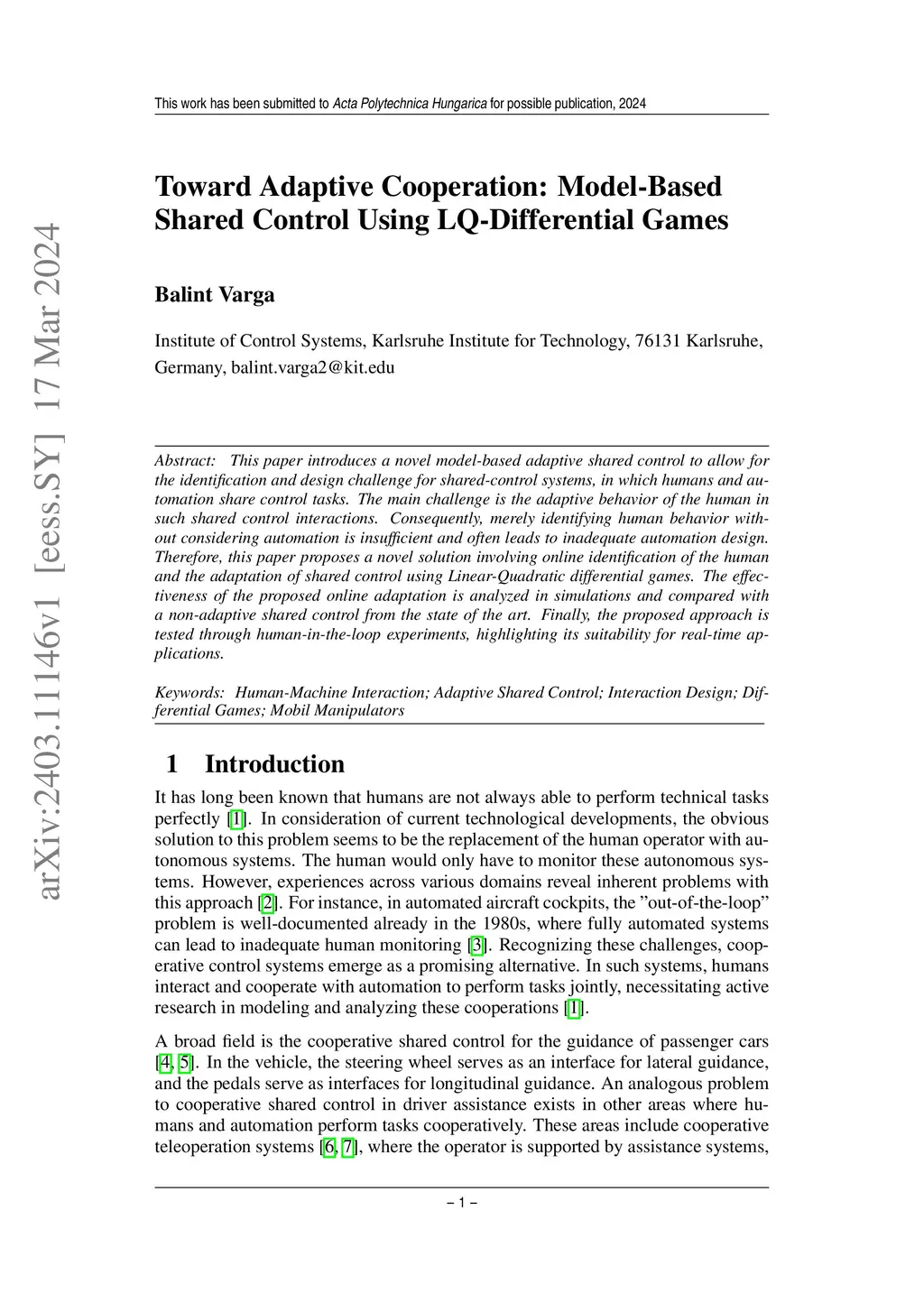 This paper introduces a novel model-based adaptive shared control to allow for the identification and design challenge for shared-control systems, in which humans and automation share control tasks. The main challenge is the adaptive behavior of the human in such shared control interactions. Consequently, merely identifying human behavior without considering automation is insufficient and often leads to inadequate automation design. Therefore, this paper proposes a novel solution involving online identification of the human and the adaptation of shared control using Linear-Quadratic differential games. The effectiveness of the proposed online adaptation is analyzed in simulations and compared with a non-adaptive shared control from the state of the art. Finally, the proposed approach is tested through human-in-the-loop experiments, highlighting its suitability for real-time applications.