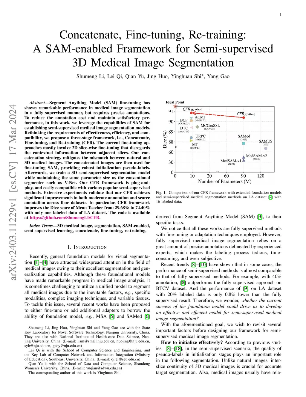 Segment Anything Model (SAM) fine-tuning has shown remarkable performance in medical image segmentation in a fully supervised manner, but requires precise annotations. To reduce the annotation cost and maintain satisfactory performance, in this work, we leverage the capabilities of SAM for establishing semi-supervised medical image segmentation models. Rethinking the requirements of effectiveness, efficiency, and compatibility, we propose a three-stage framework, i.e., Stitching, Fine-tuning, and Re-training (SFR). The current fine-tuning approaches mostly involve 2D slice-wise fine-tuning that disregards the contextual information between adjacent slices. Our stitching strategy mitigates the mismatch between natural and 3D medical images. The stitched images are then used for fine-tuning SAM, providing robust initialization of pseudo-labels. Afterwards, we train a 3D semi-supervised segmentation model while maintaining the same parameter size as the conventional segmenter such as V-Net. Our SFR framework is plug-and-play, and easily compatible with various popular semi-supervised methods. We also develop an extended framework SFR with selective fine-tuning and re-training through confidence estimation. Extensive experiments validate that our SFR and SFR achieve significant improvements in both moderate annotation and scarce annotation across five datasets. In particular, SFR framework improves the Dice score of Mean Teacher from 29.68% to 74.40% with only one labeled data of LA dataset.