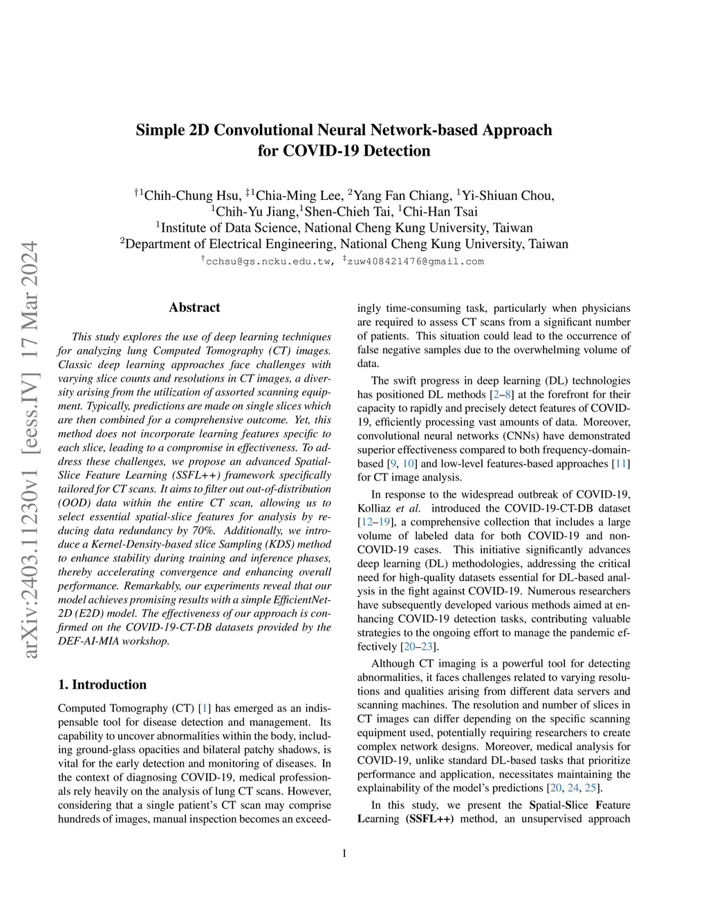 This study explores the use of deep learning techniques for analyzing lung Computed Tomography (CT) images. Classic deep learning approaches face challenges with varying slice counts and resolutions in CT images, a diversity arising from the utilization of assorted scanning equipment. Typically, predictions are made on single slices which are then combined for a comprehensive outcome. Yet, this method does not incorporate learning features specific to each slice, leading to a compromise in effectiveness. To address these challenges, we propose an advanced Spatial-Slice Feature Learning (SSFL++) framework specifically tailored for CT scans. It aims to filter out out-of-distribution (OOD) data within the entire CT scan, allowing us to select essential spatial-slice features for analysis by reducing data redundancy by 70\%. Additionally, we introduce a Kernel-Density-based slice Sampling (KDS) method to enhance stability during training and inference phases, thereby accelerating convergence and enhancing overall performance. Remarkably, our experiments reveal that our model achieves promising results with a simple EfficientNet-2D (E2D) model. The effectiveness of our approach is confirmed on the COVID-19-CT-DB datasets provided by the DEF-AI-MIA workshop.