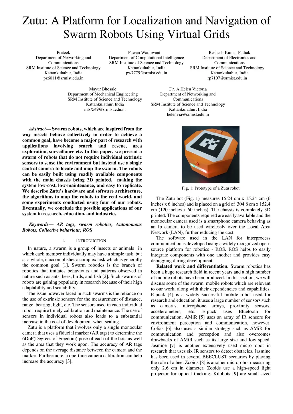 Swarm robots, which are inspired from the way insects behave collectively in order to achieve a common goal, have become a major part of research with applications involving search and rescue, area exploration, surveillance etc. In this paper, we present a swarm of robots that do not require individual extrinsic sensors to sense the environment but instead use a single central camera to locate and map the swarm. The robots can be easily built using readily available components with the main chassis being 3D printed, making the system low-cost, low-maintenance, and easy to replicate. We describe Zutu's hardware and software architecture, the algorithms to map the robots to the real world, and some experiments conducted using four of our robots. Eventually, we conclude the possible applications of our system in research, education, and industries.
