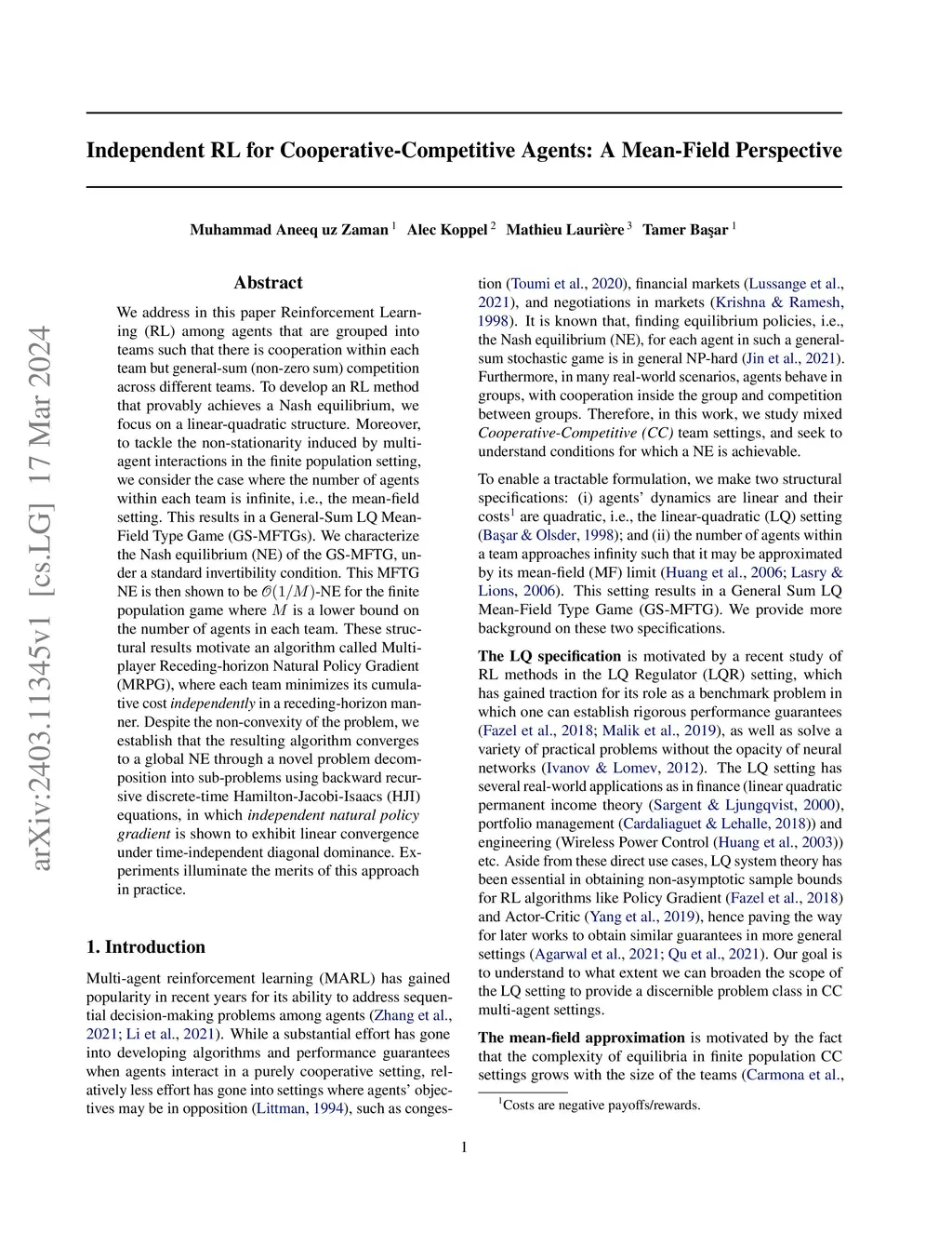 We address in this paper Reinforcement Learning (RL) among agents that are grouped into teams such that there is cooperation within each team but general-sum (non-zero sum) competition across different teams. To develop an RL method that provably achieves a Nash equilibrium, we focus on a linear-quadratic structure. Moreover, to tackle the non-stationarity induced by multi-agent interactions in the finite population setting, we consider the case where the number of agents within each team is infinite, i.e., the mean-field setting. This results in a General-Sum LQ Mean-Field Type Game (GS-MFTG). We characterize the Nash equilibrium (NE) of the GS-MFTG, under a standard invertibility condition. This MFTG NE is then shown to be -NE for the finite population game where is a lower bound on the number of agents in each team. These structural results motivate an algorithm called Multi-player Receding-horizon Natural Policy Gradient (MRNPG), where each team minimizes its cumulative cost \emph{independently} in a receding-horizon manner. Despite the non-convexity of the problem, we establish that the resulting algorithm converges to a global NE through a novel problem decomposition into sub-problems using backward recursive discrete-time Hamilton-Jacobi-Isaacs (HJI) equations, in which \emph{independent natural policy gradient} is shown to exhibit linear convergence under time-independent diagonal dominance. Numerical studies included corroborate the theoretical results.