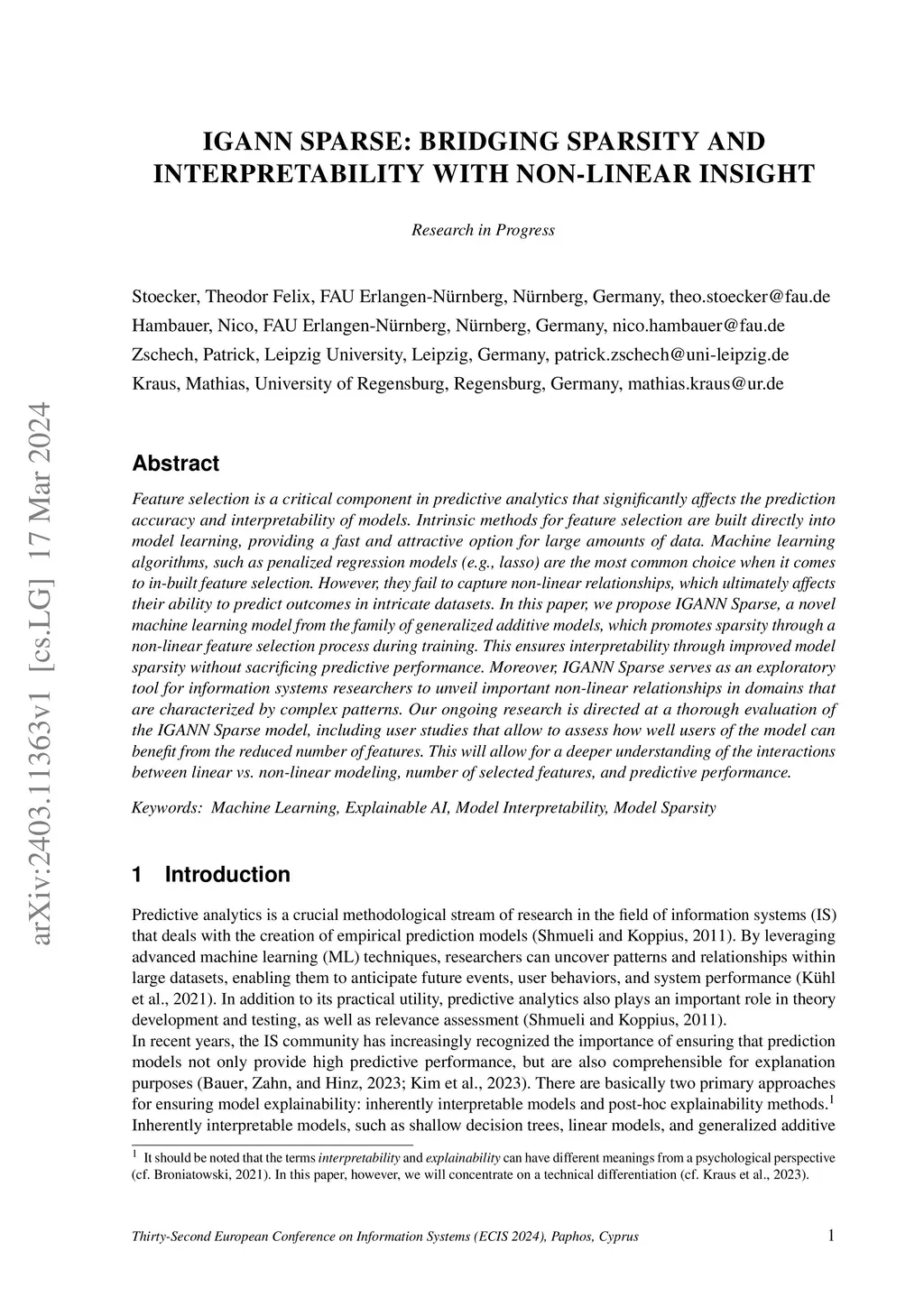 Feature selection is a critical component in predictive analytics that significantly affects the prediction accuracy and interpretability of models. Intrinsic methods for feature selection are built directly into model learning, providing a fast and attractive option for large amounts of data. Machine learning algorithms, such as penalized regression models (e.g., lasso) are the most common choice when it comes to in-built feature selection. However, they fail to capture non-linear relationships, which ultimately affects their ability to predict outcomes in intricate datasets. In this paper, we propose IGANN Sparse, a novel machine learning model from the family of generalized additive models, which promotes sparsity through a non-linear feature selection process during training. This ensures interpretability through improved model sparsity without sacrificing predictive performance. Moreover, IGANN Sparse serves as an exploratory tool for information systems researchers to unveil important non-linear relationships in domains that are characterized by complex patterns. Our ongoing research is directed at a thorough evaluation of the IGANN Sparse model, including user studies that allow to assess how well users of the model can benefit from the reduced number of features. This will allow for a deeper understanding of the interactions between linear vs. non-linear modeling, number of selected features, and predictive performance.