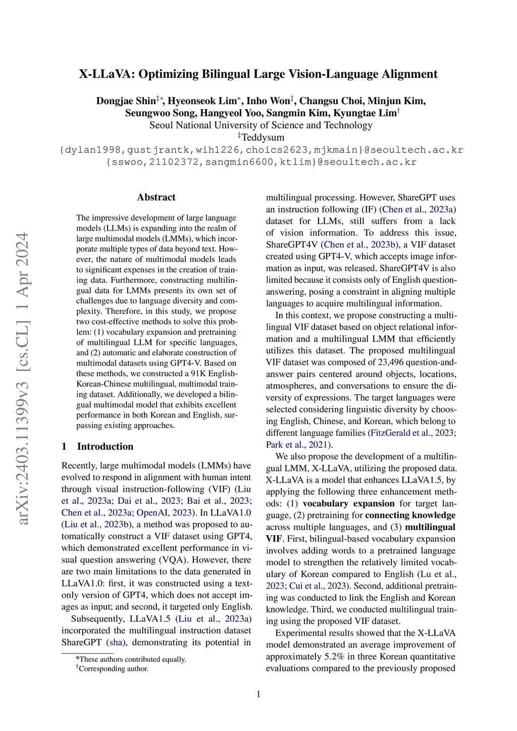 The impressive development of large language models (LLMs) is expanding into the realm of large multimodal models (LMMs), which incorporate multiple types of data beyond text. However, the nature of multimodal models leads to significant expenses in the creation of training data. Furthermore, constructing multilingual data for LMMs presents its own set of challenges due to language diversity and complexity. Therefore, in this study, we propose two cost-effective methods to solve this problem: (1) vocabulary expansion and pretraining of multilingual LLM for specific languages, and (2) automatic and elaborate construction of multimodal datasets using GPT4-V. Based on015 these methods, we constructed a 91K English-Korean-Chinese multilingual, multimodal training dataset. Additionally, we developed a bilingual multimodal model that exhibits excellent performance in both Korean and English, surpassing existing approaches.