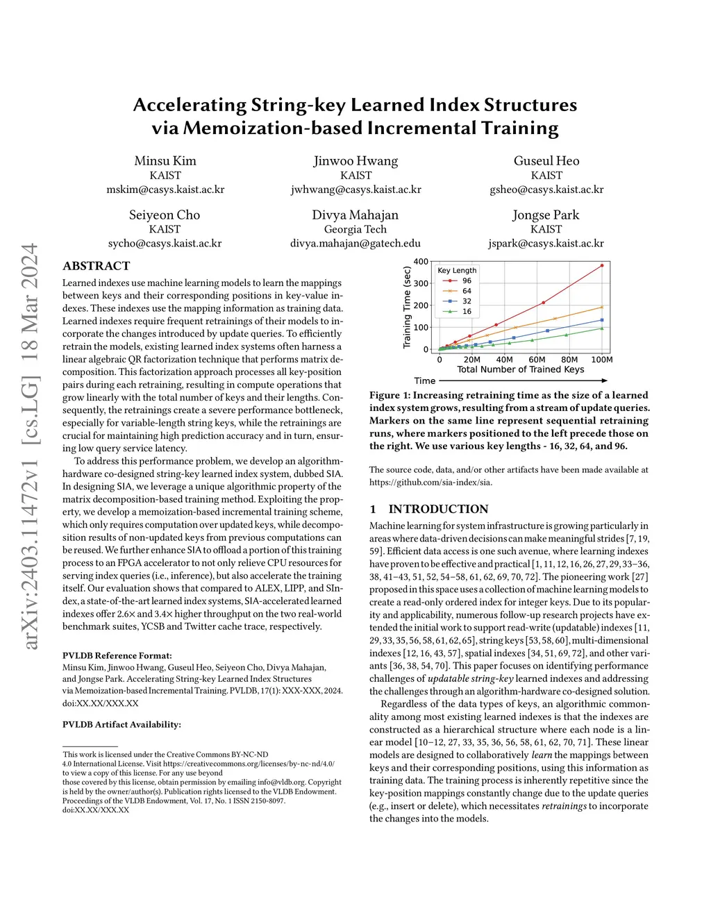 Learned indexes use machine learning models to learn the mappings between keys and their corresponding positions in key-value indexes. These indexes use the mapping information as training data. Learned indexes require frequent retrainings of their models to incorporate the changes introduced by update queries. To efficiently retrain the models, existing learned index systems often harness a linear algebraic QR factorization technique that performs matrix decomposition. This factorization approach processes all key-position pairs during each retraining, resulting in compute operations that grow linearly with the total number of keys and their lengths. Consequently, the retrainings create a severe performance bottleneck, especially for variable-length string keys, while the retrainings are crucial for maintaining high prediction accuracy and in turn, ensuring low query service latency. To address this performance problem, we develop an algorithm-hardware co-designed string-key learned index system, dubbed SIA. In designing SIA, we leverage a unique algorithmic property of the matrix decomposition-based training method. Exploiting the property, we develop a memoization-based incremental training scheme, which only requires computation over updated keys, while decomposition results of non-updated keys from previous computations can be reused. We further enhance SIA to offload a portion of this training process to an FPGA accelerator to not only relieve CPU resources for serving index queries (i.e., inference), but also accelerate the training itself. Our evaluation shows that compared to ALEX, LIPP, and SIndex, a state-of-the-art learned index systems, SIA-accelerated learned indexes offer 2.6x and 3.4x higher throughput on the two real-world benchmark suites, YCSB and Twitter cache trace, respectively.