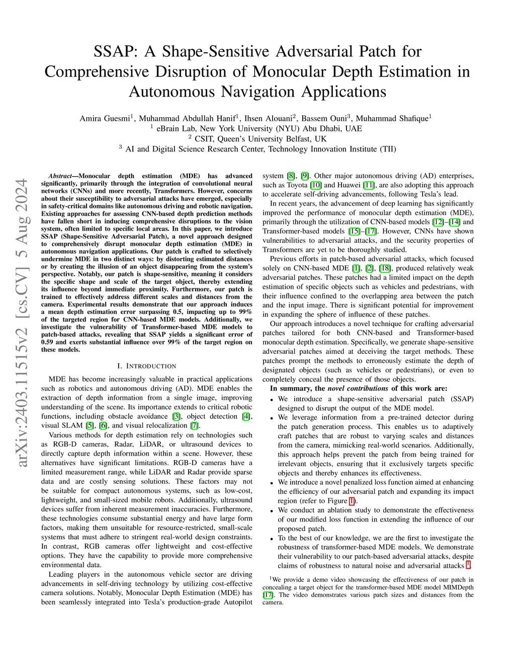 Monocular depth estimation (MDE) has advanced significantly, primarily through the integration of convolutional neural networks (CNNs) and more recently, Transformers. However, concerns about their susceptibility to adversarial attacks have emerged, especially in safety-critical domains like autonomous driving and robotic navigation. Existing approaches for assessing CNN-based depth prediction methods have fallen short in inducing comprehensive disruptions to the vision system, often limited to specific local areas. In this paper, we introduce SSAP (Shape-Sensitive Adversarial Patch), a novel approach designed to comprehensively disrupt monocular depth estimation (MDE) in autonomous navigation applications. Our patch is crafted to selectively undermine MDE in two distinct ways: by distorting estimated distances or by creating the illusion of an object disappearing from the system's perspective. Notably, our patch is shape-sensitive, meaning it considers the specific shape and scale of the target object, thereby extending its influence beyond immediate proximity. Furthermore, our patch is trained to effectively address different scales and distances from the camera. Experimental results demonstrate that our approach induces a mean depth estimation error surpassing 0.5, impacting up to 99% of the targeted region for CNN-based MDE models. Additionally, we investigate the vulnerability of Transformer-based MDE models to patch-based attacks, revealing that SSAP yields a significant error of 0.59 and exerts substantial influence over 99% of the target region on these models.