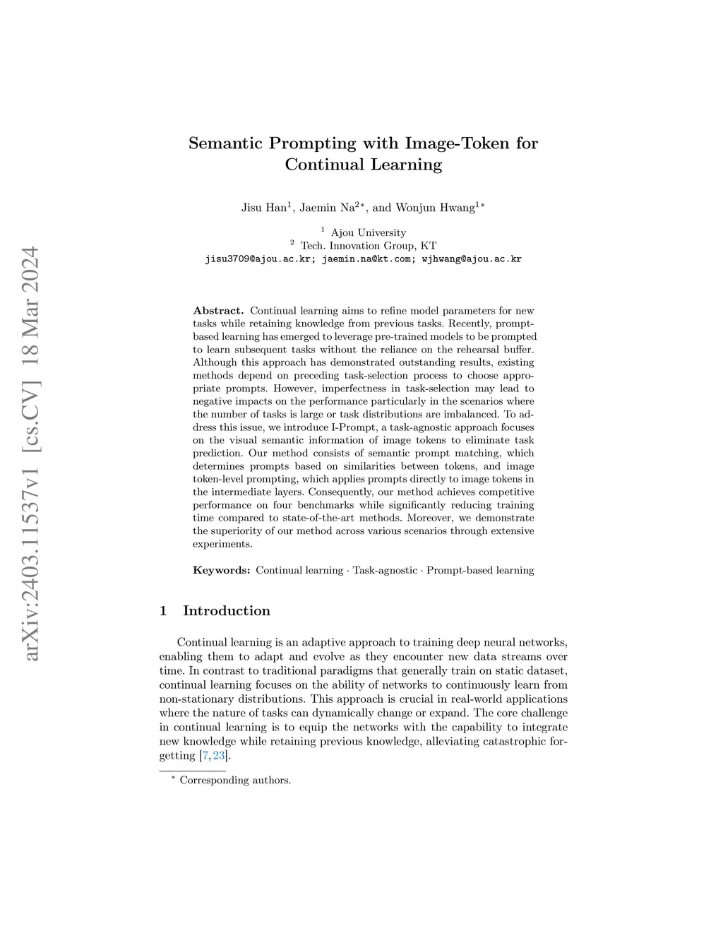 Continual learning aims to refine model parameters for new tasks while retaining knowledge from previous tasks. Recently, prompt-based learning has emerged to leverage pre-trained models to be prompted to learn subsequent tasks without the reliance on the rehearsal buffer. Although this approach has demonstrated outstanding results, existing methods depend on preceding task-selection process to choose appropriate prompts. However, imperfectness in task-selection may lead to negative impacts on the performance particularly in the scenarios where the number of tasks is large or task distributions are imbalanced. To address this issue, we introduce I-Prompt, a task-agnostic approach focuses on the visual semantic information of image tokens to eliminate task prediction. Our method consists of semantic prompt matching, which determines prompts based on similarities between tokens, and image token-level prompting, which applies prompts directly to image tokens in the intermediate layers. Consequently, our method achieves competitive performance on four benchmarks while significantly reducing training time compared to state-of-the-art methods. Moreover, we demonstrate the superiority of our method across various scenarios through extensive experiments.