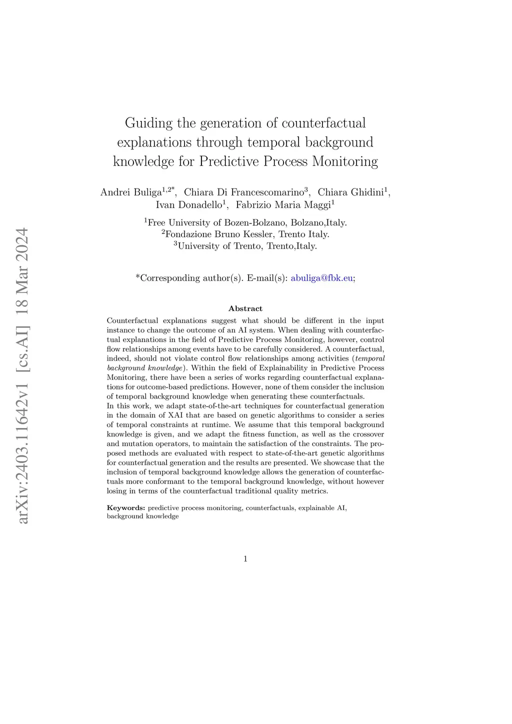 Counterfactual explanations suggest what should be different in the input instance to change the outcome of an AI system. When dealing with counterfactual explanations in the field of Predictive Process Monitoring, however, control flow relationships among events have to be carefully considered. A counterfactual, indeed, should not violate control flow relationships among activities (temporal background knowledege). Within the field of Explainability in Predictive Process Monitoring, there have been a series of works regarding counterfactual explanations for outcome-based predictions. However, none of them consider the inclusion of temporal background knowledge when generating these counterfactuals. In this work, we adapt state-of-the-art techniques for counterfactual generation in the domain of XAI that are based on genetic algorithms to consider a series of temporal constraints at runtime. We assume that this temporal background knowledge is given, and we adapt the fitness function, as well as the crossover and mutation operators, to maintain the satisfaction of the constraints. The proposed methods are evaluated with respect to state-of-the-art genetic algorithms for counterfactual generation and the results are presented. We showcase that the inclusion of temporal background knowledge allows the generation of counterfactuals more conformant to the temporal background knowledge, without however losing in terms of the counterfactual traditional quality metrics.