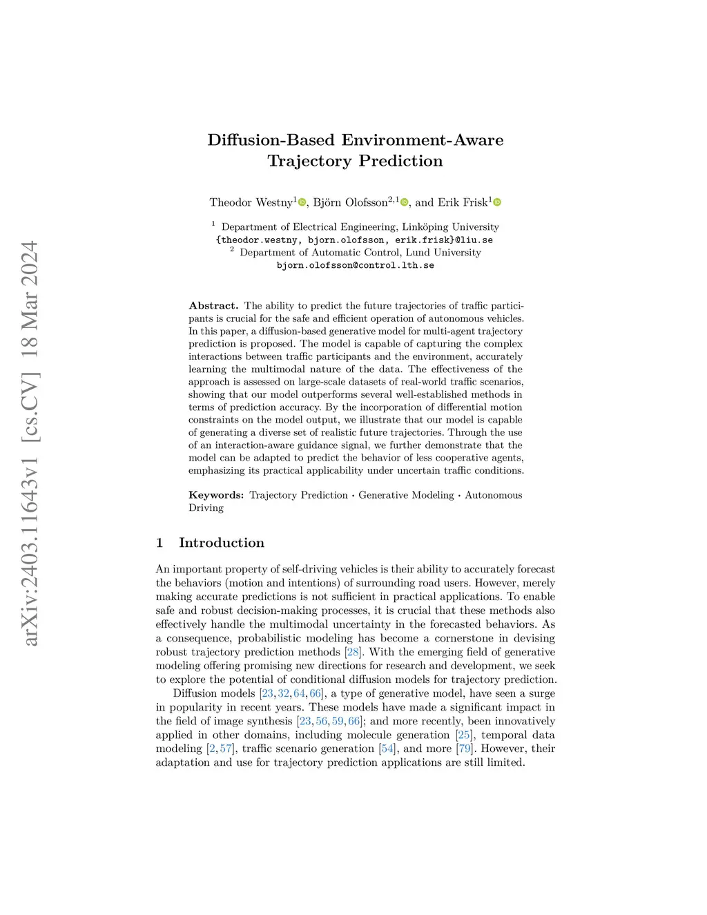 The ability to predict the future trajectories of traffic participants is crucial for the safe and efficient operation of autonomous vehicles. In this paper, a diffusion-based generative model for multi-agent trajectory prediction is proposed. The model is capable of capturing the complex interactions between traffic participants and the environment, accurately learning the multimodal nature of the data. The effectiveness of the approach is assessed on large-scale datasets of real-world traffic scenarios, showing that our model outperforms several well-established methods in terms of prediction accuracy. By the incorporation of differential motion constraints on the model output, we illustrate that our model is capable of generating a diverse set of realistic future trajectories. Through the use of an interaction-aware guidance signal, we further demonstrate that the model can be adapted to predict the behavior of less cooperative agents, emphasizing its practical applicability under uncertain traffic conditions.