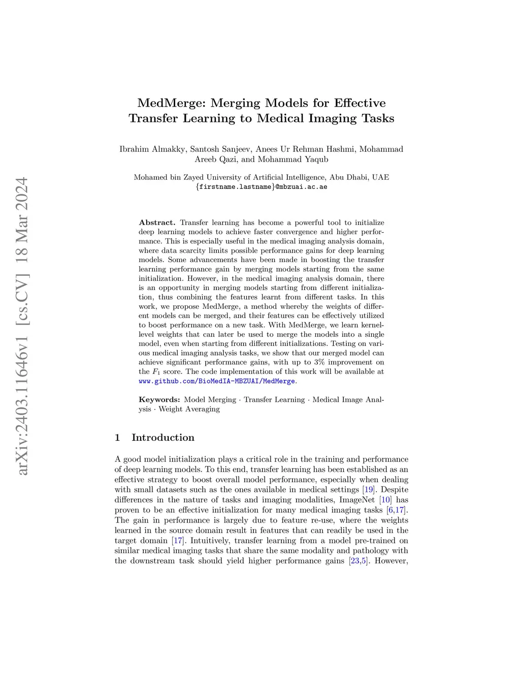 Transfer learning has become a powerful tool to initialize deep learning models to achieve faster convergence and higher performance. This is especially useful in the medical imaging analysis domain, where data scarcity limits possible performance gains for deep learning models. Some advancements have been made in boosting the transfer learning performance gain by merging models starting from the same initialization. However, in the medical imaging analysis domain, there is an opportunity to merge models starting from different initializations, thus combining the features learned from different tasks. In this work, we propose MedMerge, a method whereby the weights of different models can be merged, and their features can be effectively utilized to boost performance on a new task. With MedMerge, we learn kernel-level weights that can later be used to merge the models into a single model, even when starting from different initializations. Testing on various medical imaging analysis tasks, we show that our merged model can achieve significant performance gains, with up to 7% improvement on the F1 score. The code implementation of this work is available atthis http URL.