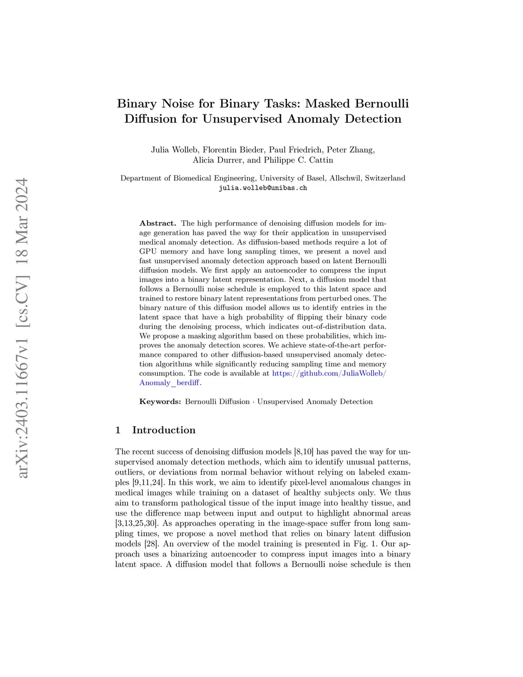 The high performance of denoising diffusion models for image generation has paved the way for their application in unsupervised medical anomaly detection. As diffusion-based methods require a lot of GPU memory and have long sampling times, we present a novel and fast unsupervised anomaly detection approach based on latent Bernoulli diffusion models. We first apply an autoencoder to compress the input images into a binary latent representation. Next, a diffusion model that follows a Bernoulli noise schedule is employed to this latent space and trained to restore binary latent representations from perturbed ones. The binary nature of this diffusion model allows us to identify entries in the latent space that have a high probability of flipping their binary code during the denoising process, which indicates out-of-distribution data. We propose a masking algorithm based on these probabilities, which improves the anomaly detection scores. We achieve state-of-the-art performance compared to other diffusion-based unsupervised anomaly detection algorithms while significantly reducing sampling time and memory consumption. The code is available at https://github.com/JuliaWolleb/Anomaly_berdiff.