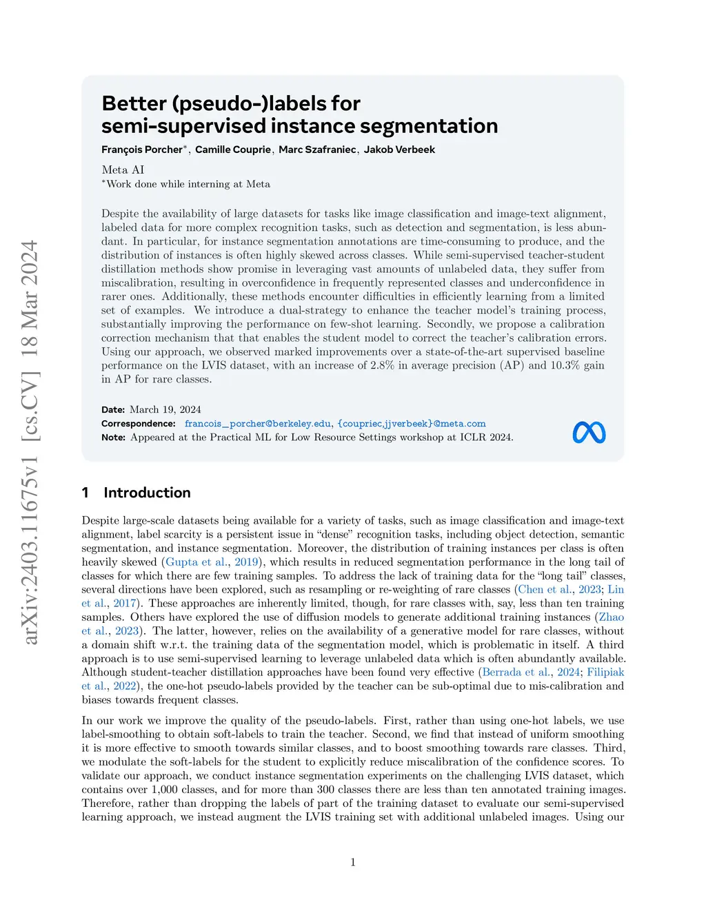 Despite the availability of large datasets for tasks like image classification and image-text alignment, labeled data for more complex recognition tasks, such as detection and segmentation, is less abundant. In particular, for instance segmentation annotations are time-consuming to produce, and the distribution of instances is often highly skewed across classes. While semi-supervised teacher-student distillation methods show promise in leveraging vast amounts of unlabeled data, they suffer from miscalibration, resulting in overconfidence in frequently represented classes and underconfidence in rarer ones. Additionally, these methods encounter difficulties in efficiently learning from a limited set of examples. We introduce a dual-strategy to enhance the teacher model's training process, substantially improving the performance on few-shot learning. Secondly, we propose a calibration correction mechanism that that enables the student model to correct the teacher's calibration errors. Using our approach, we observed marked improvements over a state-of-the-art supervised baseline performance on the LVIS dataset, with an increase of 2.8% in average precision (AP) and 10.3% gain in AP for rare classes.