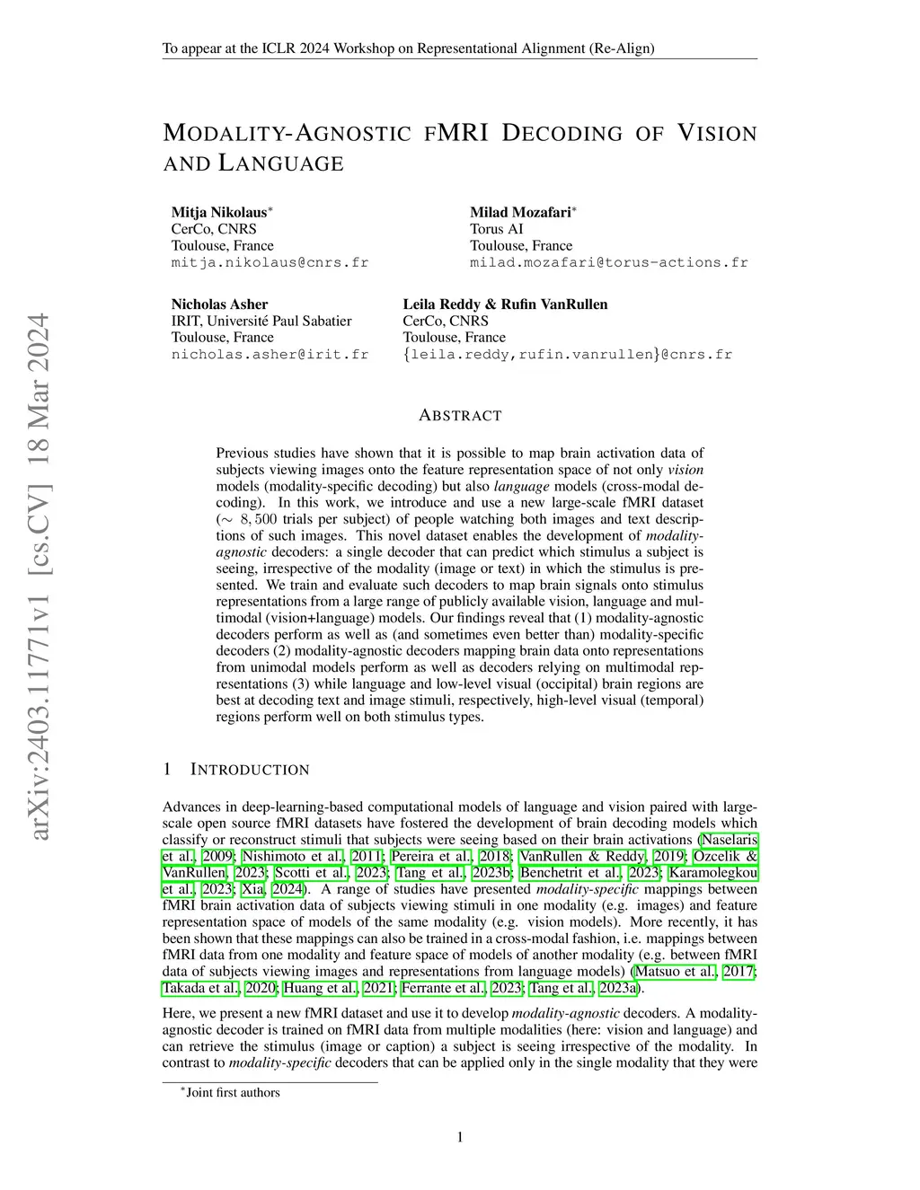Previous studies have shown that it is possible to map brain activation data of subjects viewing images onto the feature representation space of not only vision models (modality-specific decoding) but also language models (cross-modal decoding). In this work, we introduce and use a new large-scale fMRI dataset (~8,500 trials per subject) of people watching both images and text descriptions of such images. This novel dataset enables the development of modality-agnostic decoders: a single decoder that can predict which stimulus a subject is seeing, irrespective of the modality (image or text) in which the stimulus is presented. We train and evaluate such decoders to map brain signals onto stimulus representations from a large range of publicly available vision, language and multimodal (vision+language) models. Our findings reveal that (1) modality-agnostic decoders perform as well as (and sometimes even better than) modality-specific decoders (2) modality-agnostic decoders mapping brain data onto representations from unimodal models perform as well as decoders relying on multimodal representations (3) while language and low-level visual (occipital) brain regions are best at decoding text and image stimuli, respectively, high-level visual (temporal) regions perform well on both stimulus types.