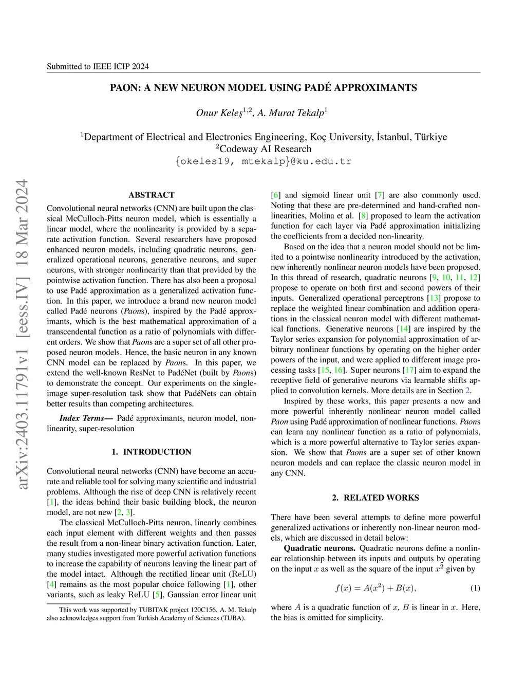 Convolutional neural networks (CNN) are built upon the classical McCulloch-Pitts neuron model, which is essentially a linear model, where the nonlinearity is provided by a separate activation function. Several researchers have proposed enhanced neuron models, including quadratic neurons, generalized operational neurons, generative neurons, and super neurons, with stronger nonlinearity than that provided by the pointwise activation function. There has also been a proposal to use Pade approximation as a generalized activation function. In this paper, we introduce a brand new neuron model called Pade neurons (Paons), inspired by the Pade approximants, which is the best mathematical approximation of a transcendental function as a ratio of polynomials with different orders. We show that Paons are a super set of all other proposed neuron models. Hence, the basic neuron in any known CNN model can be replaced by Paons. In this paper, we extend the well-known ResNet to PadeNet (built by Paons) to demonstrate the concept. Our experiments on the single-image super-resolution task show that PadeNets can obtain better results than competing architectures.