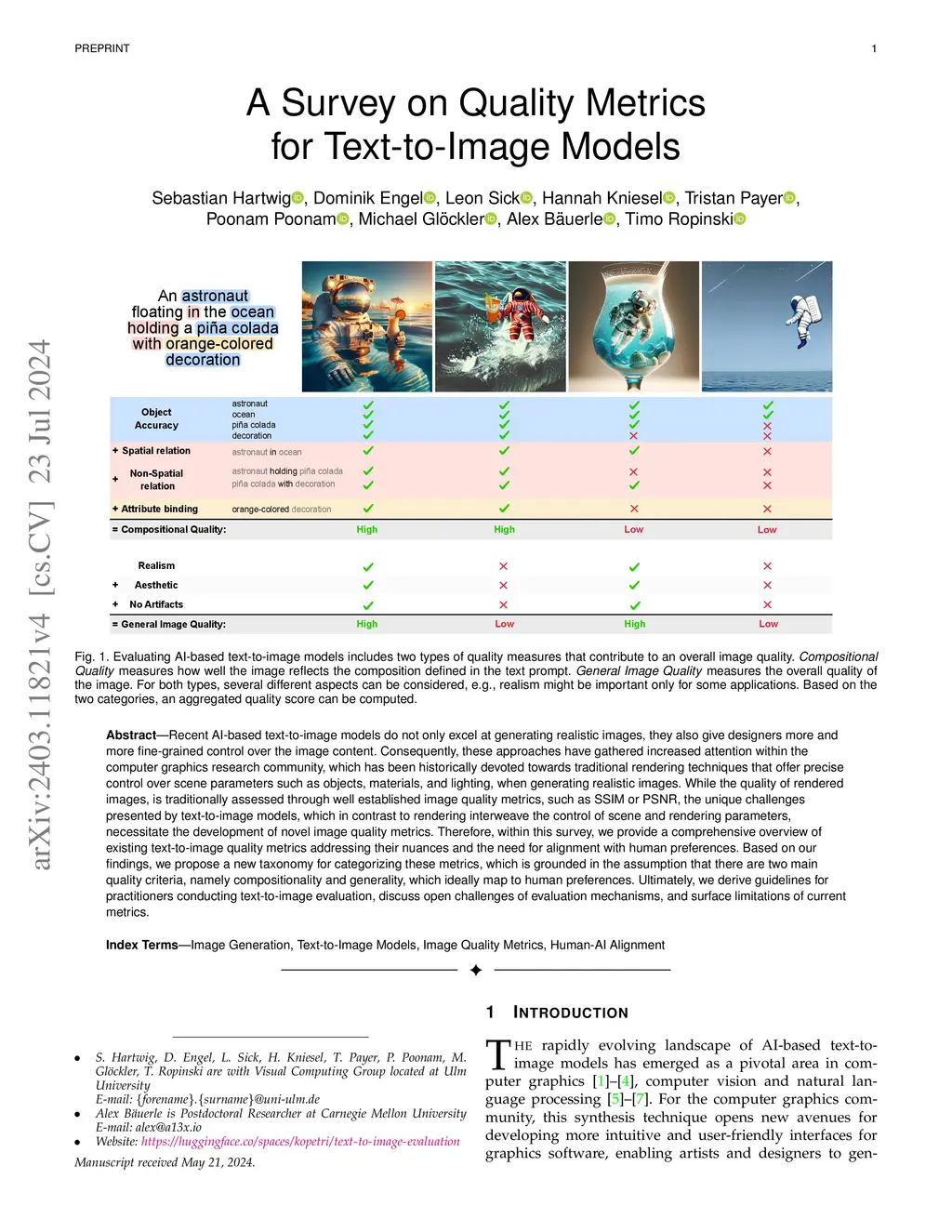 AI-based text-to-image models do not only excel at generating realistic images, they also give designers more and more fine-grained control over the image content. Consequently, these approaches have gathered increased attention within the computer graphics research community, which has been historically devoted towards traditional rendering techniques, that offer precise control over scene parameters (e.g., objects, materials, and lighting). While the quality of conventionally rendered images is assessed through well established image quality metrics, such as SSIM or PSNR, the unique challenges of text-to-image generation require other, dedicated quality metrics. These metrics must be able to not only measure overall image quality, but also how well images reflect given text prompts, whereby the control of scene and rendering parameters is interweaved. Within this survey, we provide a comprehensive overview of such text-to-image quality metrics, and propose a taxonomy to categorize these metrics. Our taxonomy is grounded in the assumption, that there are two main quality criteria, namely compositional quality and general quality, that contribute to the overall image quality. Besides the metrics, this survey covers dedicated text-to-image benchmark datasets, over which the metrics are frequently computed. Finally, we identify limitations and open challenges in the field of text-to-image generation, and derive guidelines for practitioners conducting text-to-image evaluation.