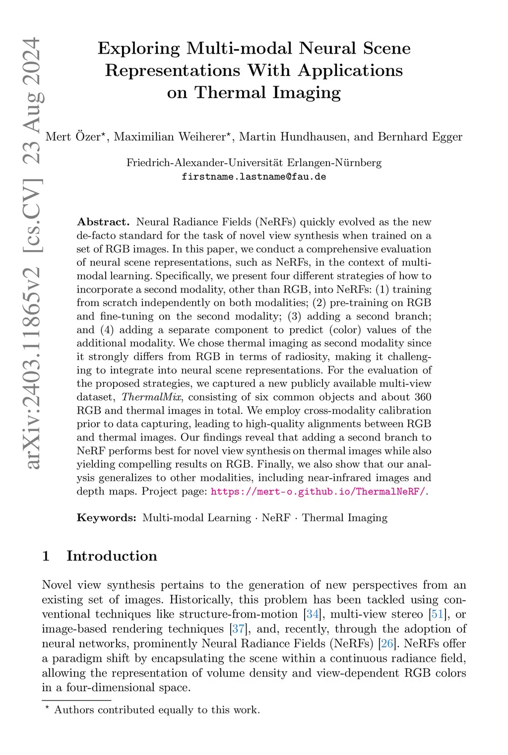 Neural Radiance Fields (NeRFs) quickly evolved as the new de-facto standard for the task of novel view synthesis when trained on a set of RGB images. In this paper, we conduct a comprehensive evaluation of neural scene representations, such as NeRFs, in the context of multi-modal learning. Specifically, we present four different strategies of how to incorporate a second modality, other than RGB, into NeRFs: (1) training from scratch independently on both modalities; (2) pre-training on RGB and fine-tuning on the second modality; (3) adding a second branch; and (4) adding a separate component to predict (color) values of the additional modality. We chose thermal imaging as second modality since it strongly differs from RGB in terms of radiosity, making it challenging to integrate into neural scene representations. For the evaluation of the proposed strategies, we captured a new publicly available multi-view dataset, ThermalMix, consisting of six common objects and about 360 RGB and thermal images in total. We employ cross-modality calibration prior to data capturing, leading to high-quality alignments between RGB and thermal images. Our findings reveal that adding a second branch to NeRF performs best for novel view synthesis on thermal images while also yielding compelling results on RGB. Finally, we also show that our analysis generalizes to other modalities, including near-infrared images and depth maps. Project page: https://mert-o.github.io/ThermalNeRF/.
