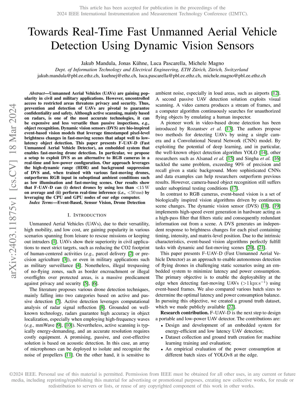Unmanned Aerial Vehicles (UAVs) are gaining popularity in civil and military applications. However, uncontrolled access to restricted areas threatens privacy and security. Thus, prevention and detection of UAVs are pivotal to guarantee confidentiality and safety. Although active scanning, mainly based on radars, is one of the most accurate technologies, it can be expensive and less versatile than passive inspections, e.g., object recognition. Dynamic vision sensors (DVS) are bio-inspired event-based vision models that leverage timestamped pixel-level brightness changes in fast-moving scenes that adapt well to low-latency object detection. This paper presents F-UAV-D (Fast Unmanned Aerial Vehicle Detector), an embedded system that enables fast-moving drone detection. In particular, we propose a setup to exploit DVS as an alternative to RGB cameras in a real-time and low-power configuration. Our approach leverages the high-dynamic range (HDR) and background suppression of DVS and, when trained with various fast-moving drones, outperforms RGB input in suboptimal ambient conditions such as low illumination and fast-moving scenes. Our results show that F-UAV-D can (i) detect drones by using less than <15 W on average and (ii) perform real-time inference (i.e., <50 ms) by leveraging the CPU and GPU nodes of our edge computer.