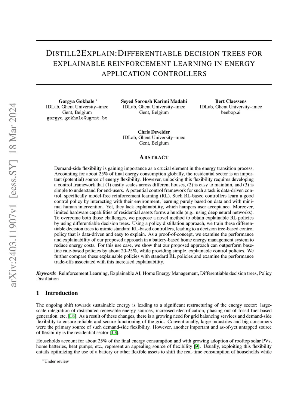 Demand-side flexibility is gaining importance as a crucial element in the energy transition process. Accounting for about 25% of final energy consumption globally, the residential sector is an important (potential) source of energy flexibility. However, unlocking this flexibility requires developing a control framework that (1) easily scales across different houses, (2) is easy to maintain, and (3) is simple to understand for end-users. A potential control framework for such a task is data-driven control, specifically model-free reinforcement learning (RL). Such RL-based controllers learn a good control policy by interacting with their environment, learning purely based on data and with minimal human intervention. Yet, they lack explainability, which hampers user acceptance. Moreover, limited hardware capabilities of residential assets forms a hurdle (e.g., using deep neural networks). To overcome both those challenges, we propose a novel method to obtain explainable RL policies by using differentiable decision trees. Using a policy distillation approach, we train these differentiable decision trees to mimic standard RL-based controllers, leading to a decision tree-based control policy that is data-driven and easy to explain. As a proof-of-concept, we examine the performance and explainability of our proposed approach in a battery-based home energy management system to reduce energy costs. For this use case, we show that our proposed approach can outperform baseline rule-based policies by about 20-25%, while providing simple, explainable control policies. We further compare these explainable policies with standard RL policies and examine the performance trade-offs associated with this increased explainability.
