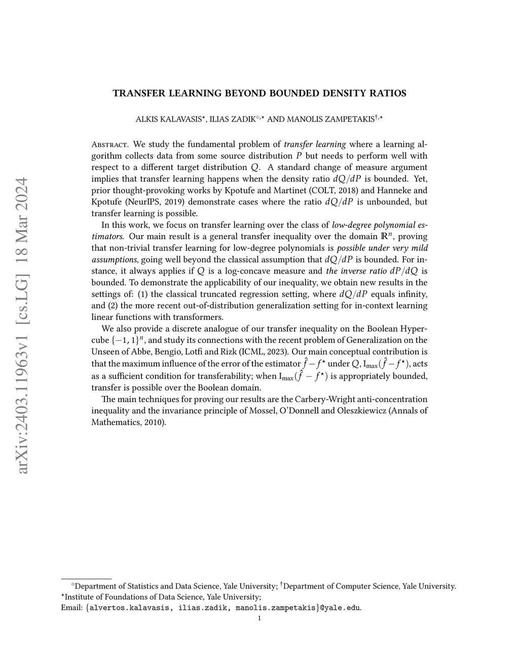 We study the fundamental problem of transfer learning where a learning algorithm collects data from some source distribution but needs to perform well with respect to a different target distribution . A standard change of measure argument implies that transfer learning happens when the density ratio is bounded. Yet, prior thought-provoking works by Kpotufe and Martinet (COLT, 2018) and Hanneke and Kpotufe (NeurIPS, 2019) demonstrate cases where the ratio is unbounded, but transfer learning is possible. In this work, we focus on transfer learning over the class of low-degree polynomial estimators. Our main result is a general transfer inequality over the domain , proving that non-trivial transfer learning for low-degree polynomials is possible under very mild assumptions, going well beyond the classical assumption that is bounded. For instance, it always applies if is a log-concave measure and the inverse ratio is bounded. To demonstrate the applicability of our inequality, we obtain new results in the settings of: (1) the classical truncated regression setting, where equals infinity, and (2) the more recent out-of-distribution generalization setting for in-context learning linear functions with transformers. We also provide a discrete analogue of our transfer inequality on the Boolean Hypercube , and study its connections with the recent problem of Generalization on the Unseen of Abbe, Bengio, Lotfi and Rizk (ICML, 2023). Our main conceptual contribution is that the maximum influence of the error of the estimator under , , acts as a sufficient condition for transferability; when is appropriately bounded, transfer is possible over the Boolean domain.