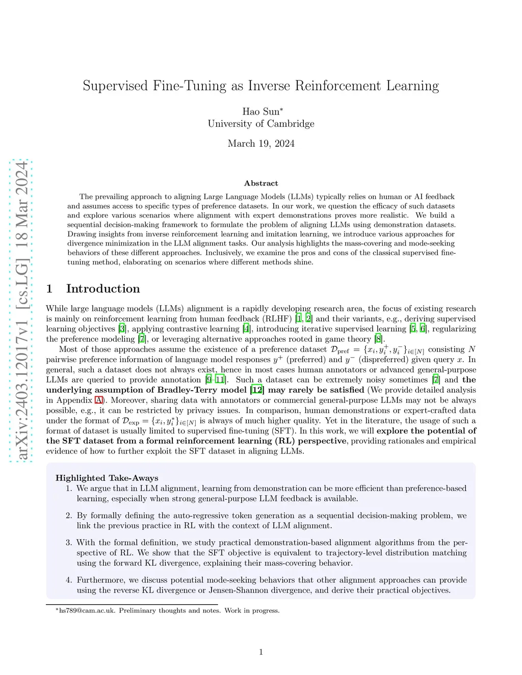 The prevailing approach to aligning Large Language Models (LLMs) typically relies on human or AI feedback and assumes access to specific types of preference datasets. In our work, we question the efficacy of such datasets and explore various scenarios where alignment with expert demonstrations proves more realistic. We build a sequential decision-making framework to formulate the problem of aligning LLMs using demonstration datasets. Drawing insights from inverse reinforcement learning and imitation learning, we introduce various approaches for divergence minimization in the LLM alignment tasks. Our analysis highlights the mass-covering and mode-seeking behaviors of these different approaches. Inclusively, we examine the pros and cons of the classical supervised fine-tuning method, elaborating on scenarios where different methods shine.