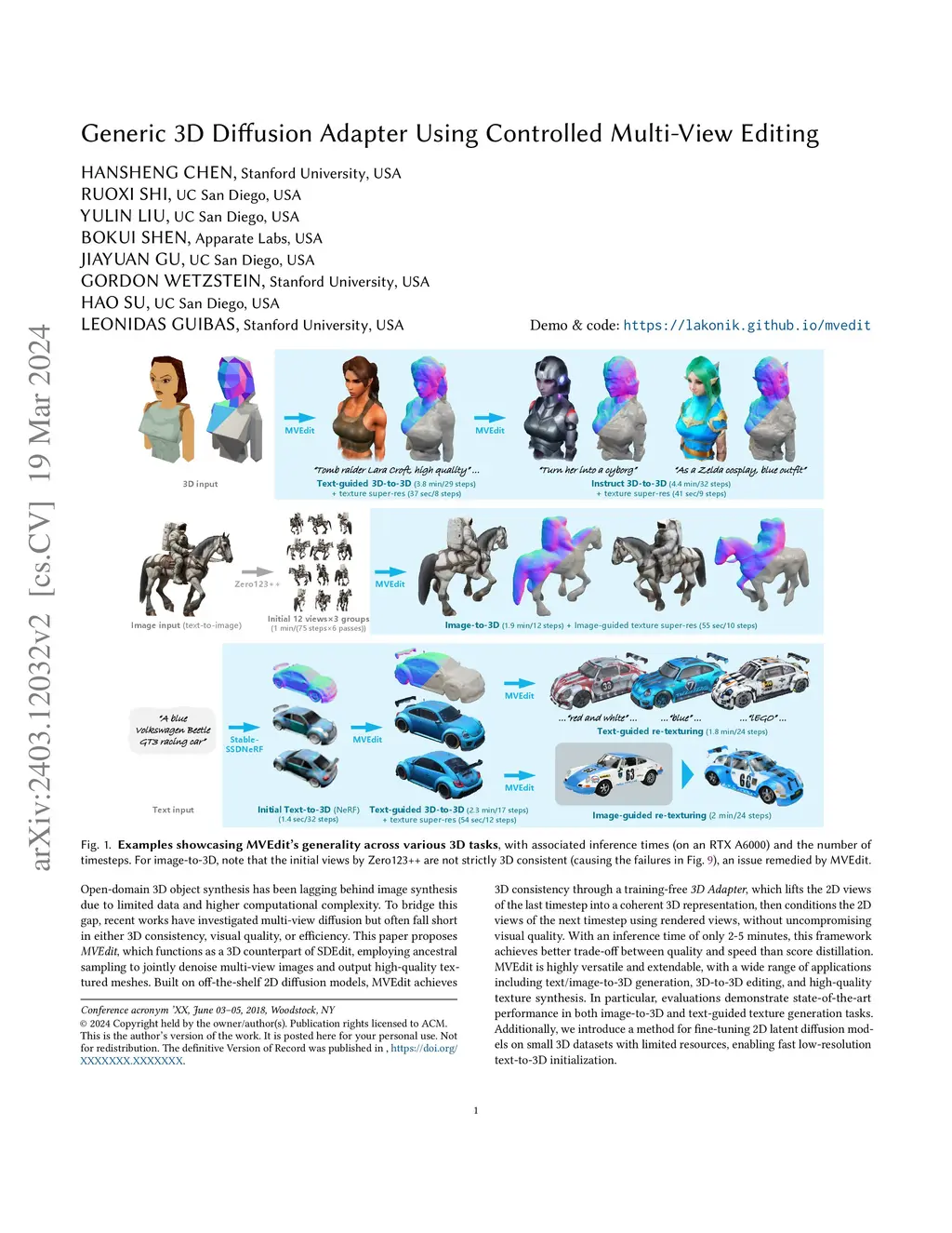 Open-domain 3D object synthesis has been lagging behind image synthesis due to limited data and higher computational complexity. To bridge this gap, recent works have investigated multi-view diffusion but often fall short in either 3D consistency, visual quality, or efficiency. This paper proposes MVEdit, which functions as a 3D counterpart of SDEdit, employing ancestral sampling to jointly denoise multi-view images and output high-quality textured meshes. Built on off-the-shelf 2D diffusion models, MVEdit achieves 3D consistency through a training-free 3D Adapter, which lifts the 2D views of the last timestep into a coherent 3D representation, then conditions the 2D views of the next timestep using rendered views, without uncompromising visual quality. With an inference time of only 2-5 minutes, this framework achieves better trade-off between quality and speed than score distillation. MVEdit is highly versatile and extendable, with a wide range of applications including text/image-to-3D generation, 3D-to-3D editing, and high-quality texture synthesis. In particular, evaluations demonstrate state-of-the-art performance in both image-to-3D and text-guided texture generation tasks. Additionally, we introduce a method for fine-tuning 2D latent diffusion models on small 3D datasets with limited resources, enabling fast low-resolution text-to-3D initialization.