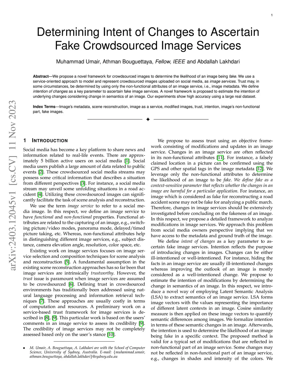We propose a novel framework for crowdsourced images to determine the likelihood of an image being fake. We use a service-oriented approach to model and represent crowdsourced images uploaded on social media, as image services. Trust may, in some circumstances, be determined by using only the non-functional attributes of an image service, i.e., image metadata. We define intention of changes as a key parameter to ascertain fake image services. A novel framework is proposed to estimate the intention of underlying changes considering change in semantics of an image. Our experiments show high accuracy using a large real dataset.