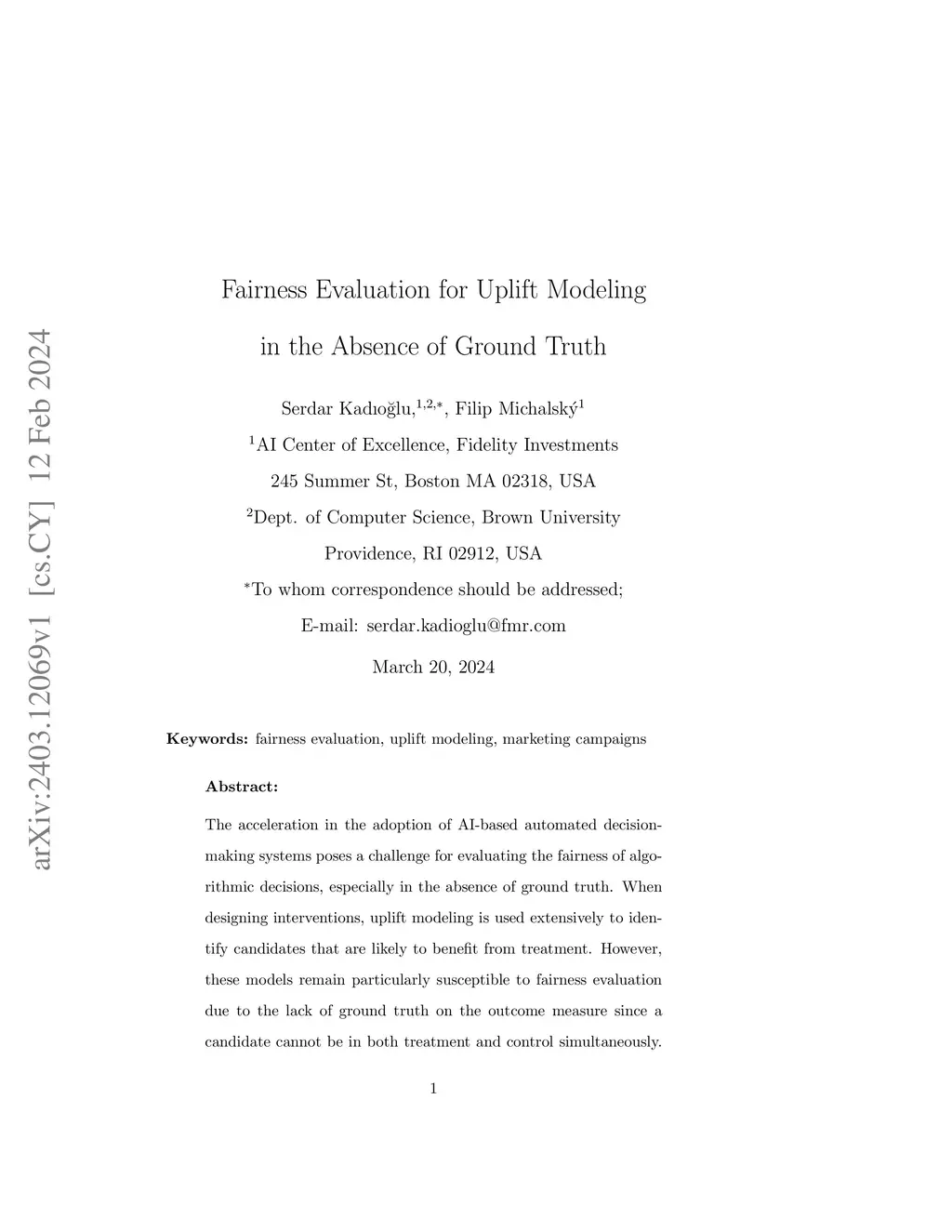 The acceleration in the adoption of AI-based automated decision-making systems poses a challenge for evaluating the fairness of algorithmic decisions, especially in the absence of ground truth. When designing interventions, uplift modeling is used extensively to identify candidates that are likely to benefit from treatment. However, these models remain particularly susceptible to fairness evaluation due to the lack of ground truth on the outcome measure since a candidate cannot be in both treatment and control simultaneously. In this article, we propose a framework that overcomes the missing ground truth problem by generating surrogates to serve as a proxy for counterfactual labels of uplift modeling campaigns. We then leverage the surrogate ground truth to conduct a more comprehensive binary fairness evaluation. We show how to apply the approach in a comprehensive study from a real-world marketing campaign for promotional offers and demonstrate its enhancement for fairness evaluation.