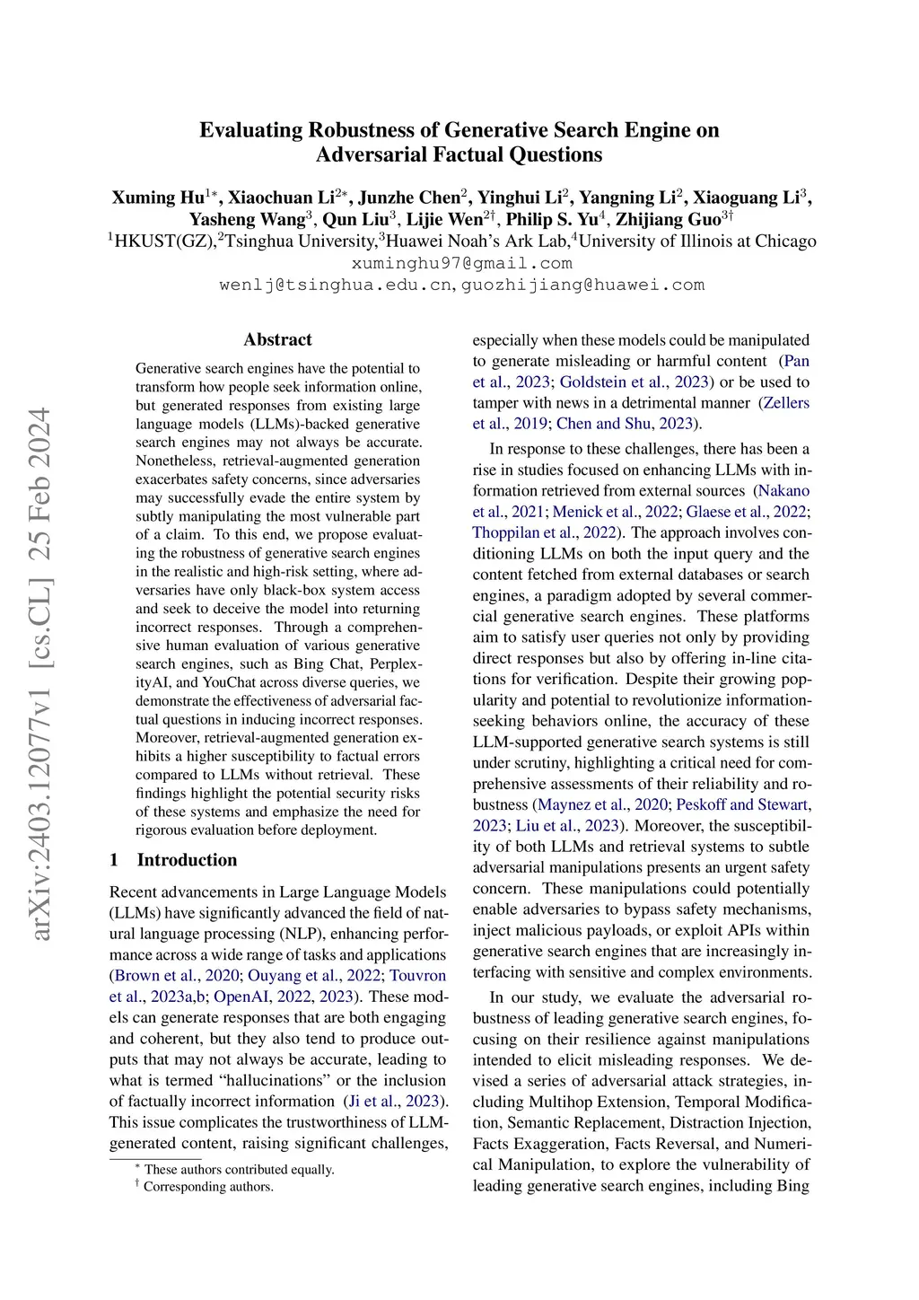 Generative search engines have the potential to transform how people seek information online, but generated responses from existing large language models (LLMs)-backed generative search engines may not always be accurate. Nonetheless, retrieval-augmented generation exacerbates safety concerns, since adversaries may successfully evade the entire system by subtly manipulating the most vulnerable part of a claim. To this end, we propose evaluating the robustness of generative search engines in the realistic and high-risk setting, where adversaries have only black-box system access and seek to deceive the model into returning incorrect responses. Through a comprehensive human evaluation of various generative search engines, such as Bing Chat, PerplexityAI, and YouChat across diverse queries, we demonstrate the effectiveness of adversarial factual questions in inducing incorrect responses. Moreover, retrieval-augmented generation exhibits a higher susceptibility to factual errors compared to LLMs without retrieval. These findings highlight the potential security risks of these systems and emphasize the need for rigorous evaluation before deployment.